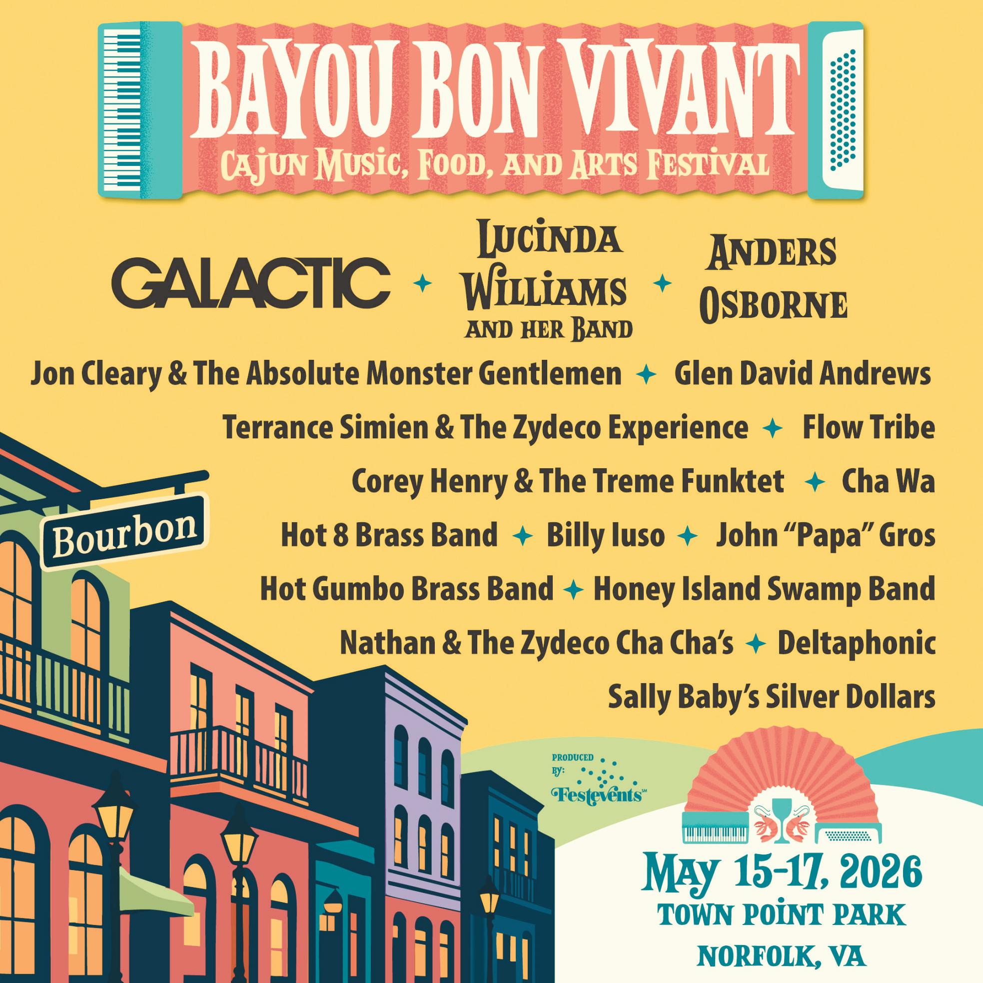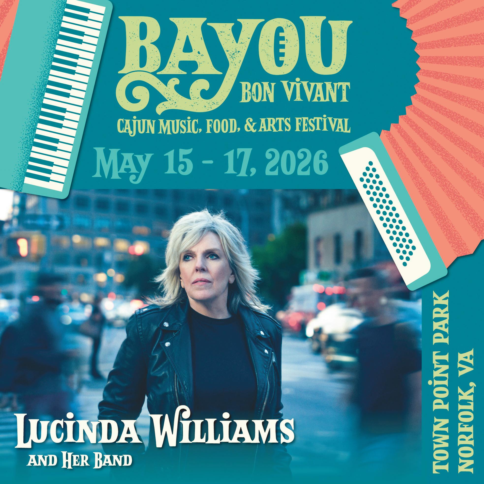 Lucinda Williams and her band join Galactic, Anders Osborne, and more for the 2026 Bayou Bon Vivant Cajun Music,Food&ArtsFestival,Friday-Sunday May15-17,2026 atTownPointParkalongtheDowntownNorfolkWaterfront!