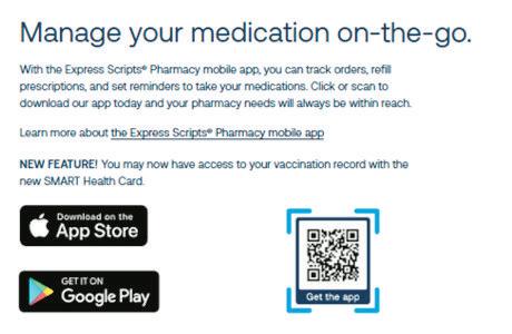 TheExpressScriptsPharmacymobileapp works with your busy scheduletomanage andtrackyourprescriptions.VisittheApple AppStoreorGooglePlayStoretodownload itforfree