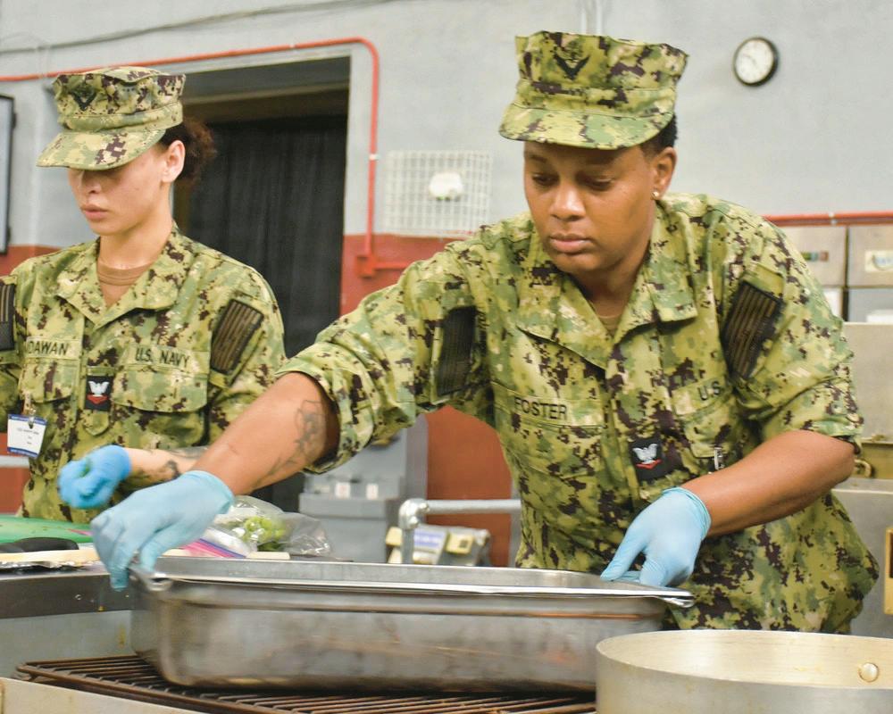 Third Class Lajasmine Foster (above right) helps prepare a meal during the Operational Hot Food Kitchen competition at the Joint Culinary Training Exercise at Fort Lee, Virginia. The team received a silver medal during this event one of several categories at the largest American Culinary Federation sanctioned competition in North America, featuring military chefs from around the world. (PHOTOS BYTHOMAS KREIDEL NAVALSUPPLYSYSTEMS COMMAND)