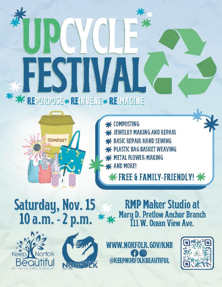 NORFOLK, Va.—Keep Norfolk Beautifulisexcited to partner with NorfolkPublic Library for the UpCycle Festival —acommunityeventtopromote sustainability,environmental stewardship and creative reuse. TheUpCycleFestivaltakesplace Saturday,Nov.15,from10a.m.to 2p.m.atMaryD.PretlowAnchor Branch Library (111 W. Ocean ViewAve.).