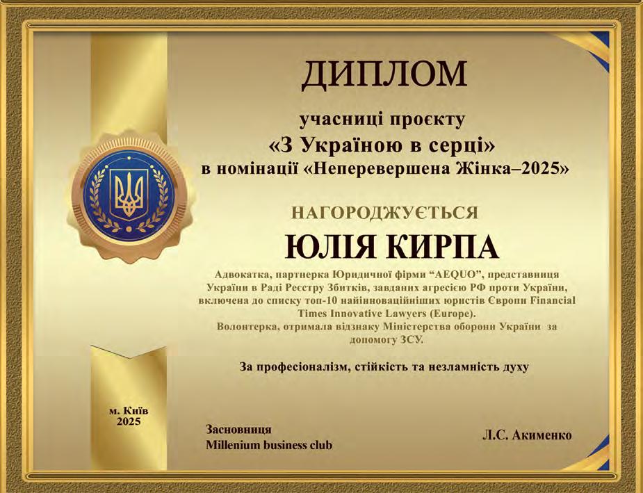 Адвокатка, партнерка Юридичної фірми “AEQUO”, представниця України в Раді Реєстру Збитків, завданих агресією РФ проти України, включена до списку топ10 найінноваційніших юристів Європи Financial Times Innovative Lawyers (Europe).