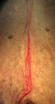 The filly quarter horse was presented with an umbilical wound measuring 9,5cm x 5cm (Picture C). Abundant granulation tissue was present at the initial consultation and the wound margins were irregular. The wound was cleaned and Topazin Equine™ applied BID for 14 days. The wound was completely healed in 21 days. Topazin Equine™ stimulated an immediate healing response which was clearly evident at 7 days (Picture D), with good scab formation and wound margin migration towards the centre. The wound healed in accelerated fashion (Picture E), approximately 50% of the expected time.