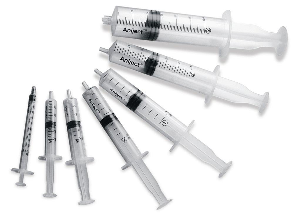 • Eccentric needle mount on 5mL and larger syringes – Easier to inject or aspirate.