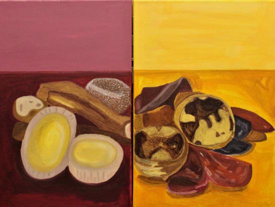 Below-right: Talisa has created a diptych in the medium of acrylic on canvas, exploring still life art and contrasting Hong Kong and Portuguese snacks.