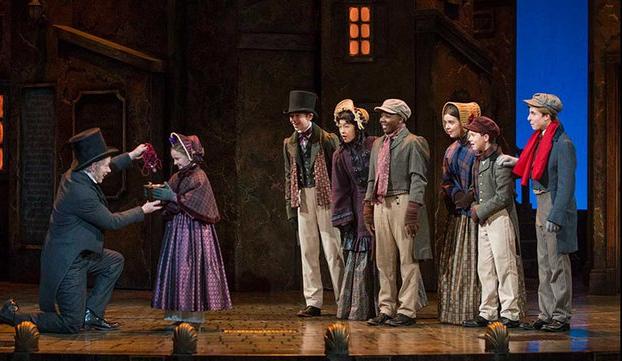 The curtain opens to reveal the author of A Christmas Carol, Charles Dickens, along with two assistants on stage. The assistants merrily greet the audience before introducing Dickens. The lights fade as Dickens reads an excerpt from his novel, “Marley was dead, to begin with...”