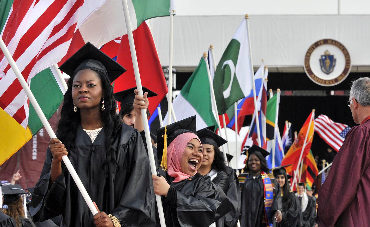 Image Source: Institute of International Education (IIE), “Enrollment Trends: International Student Data from the 2020 Open Doors Report.” International students wave their country flags at a Northeastern University commencement ceremony. Photo credit: U.S. State Department.