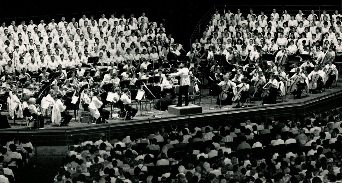 chorus showed no signs of slowing down. Foss returned that October to spearhead the Leonard Bernstein Festival alongside associate conductor JoAnn Falletta and newly appointed music director Zdeněk Mácal, with the chorus giving a reading of Bernstein’s Chichester Psalms marked by “affecting warmth and vitality” (Milwaukee Sentinel). As Mácal took up the baton, the chorus enjoyed a weightier repertory, including Dvořák’s Stabat Mater (which Mácal personally dedicated “to the memory of the world’s people who have become victims of Acquired Immune Deficiency Syndrome,” complete with pledge forms and return envelopes for the American Foundation for AIDS Research inserted into every program). The performances were hailed by Milwaukee music critic Tom Strini: “Nothing was superficial, imposed, or ornamental; every nuance in tempo and dynamic sprang directly from the harmonic and emotional necessities embedded deep in the score.” In July, the chorus returned to Ravinia for another performance of Mahler’s eighth with James Levine and the CSO, and one year later in the summer of 1988, the MSO, the MSC, and the Bel Canto Chorus came together to conclude Milwaukee’s annual German Fest with a performance of Beethoven’s Symphony No. 9 in D minor at the Marcus Amphitheater. As the first all-classical concert in the venue’s history, the event drew an audience of 12,000, the largest in the orchestra’s history, and was repeated three more times in the following years.
