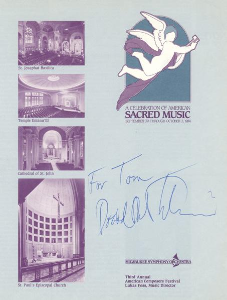 And so the 1980s, an enormously productive chapter in the MSO’s history, culminated in yet another family affair in April 1989: in honor of both the orchestra’s 30th anniversary and Margaret Hawkins, the orchestra and chorus premiered Lukas Foss’s With Music Strong, a work commissioned by the Milwaukee Symphony Orchestra League, the orchestra’s corps of volunteers. A milestone in the chorus’s career, the work was recorded on the Koss Classics label only days later and made available for commercial release.