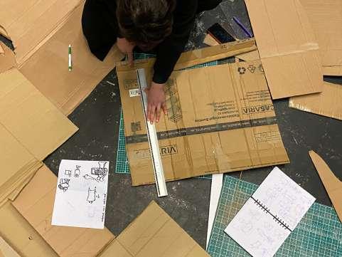 In our creative process, we aimed to make a costume prototype using everyday object / materials like boxes, plastic waste, and even an empty bin, for environmental sustainability. Our material choices, such as durable polycarbonate, wires, and 3D printing materials, were picked to not only to contribute to zero waste design but also ensure its consistent aesthetics. We took things a step further by designing a folding platform, turning the costume into a cool board game with manuals and cards.