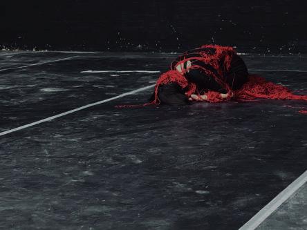 The burgundy red floor and glossy black lines, which were sketched and splattered following the trace of the