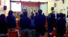 聚會先由敬拜隊以詩歌敬拜讚美開始。接著,基恩敬拜隊的高珮琳 姊妹分享她的見證(詳見下文),述說神的道如何徹底改變她的生命。