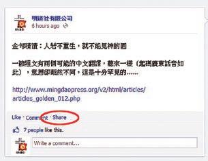 您只須點擊帖子下方的 「Share」,就可與友人分享 明道社的文章、課程、書籍和 活動等消息。這點對於引起話 題、增進彼此互動尤為有效。