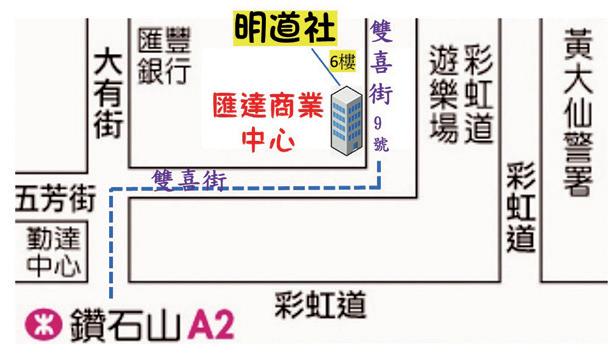 明道社辦:九龍新蒲崗雙喜街9號匯達商業中心6樓6號室,距離鑽石山港鐵站大約8分鐘路程。