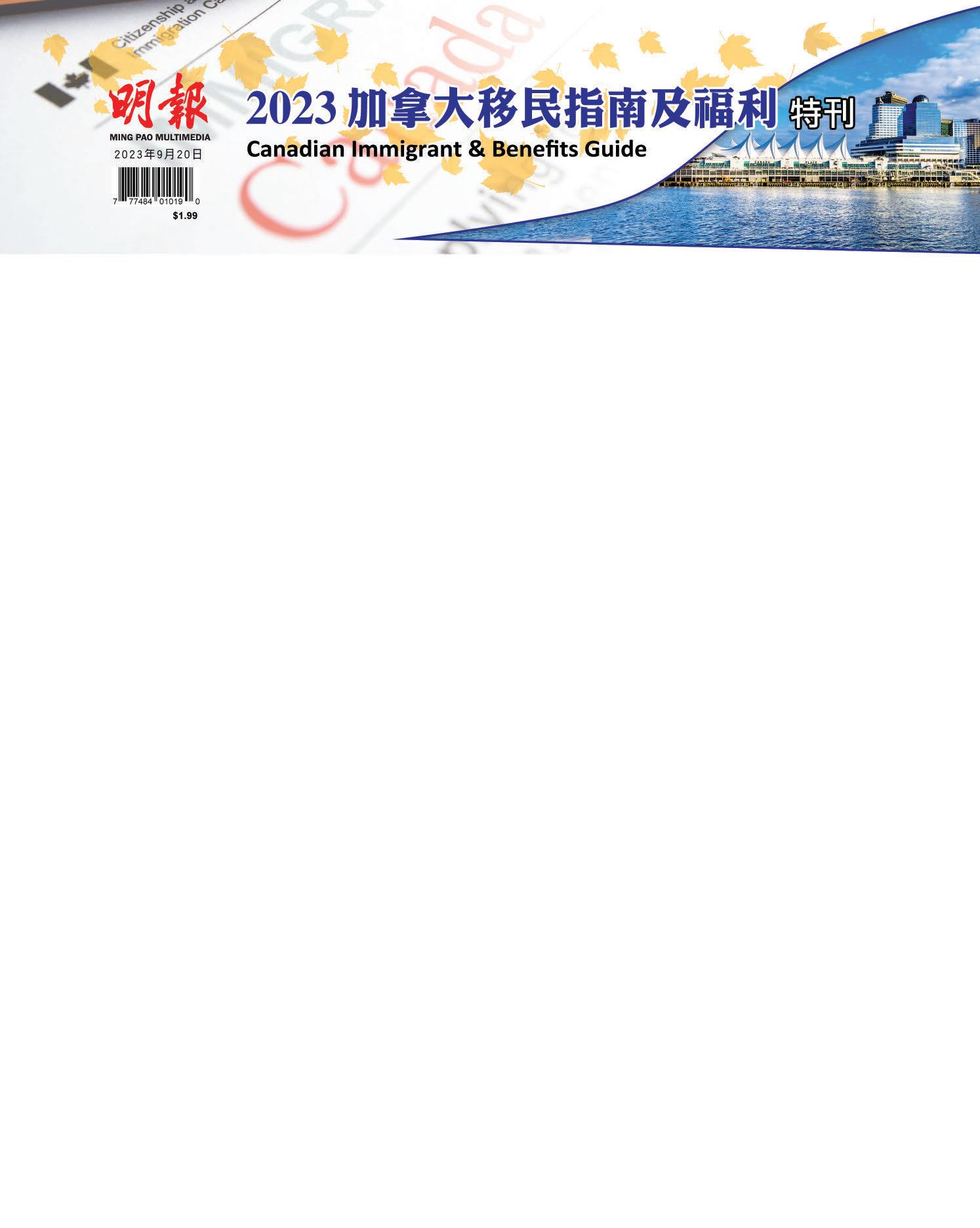 2023 Canadian Immigrant & Benefits Guide is published and printed by Ming Pao Newspapers (Canada) Ltd. 5368 Parkwood Place, Richmond, B.C. V6V 2N1. Single Copy Canada $1.99. For single copy sales, please call +1-604-2318998 or e-mail circulation@mingpaovan.com