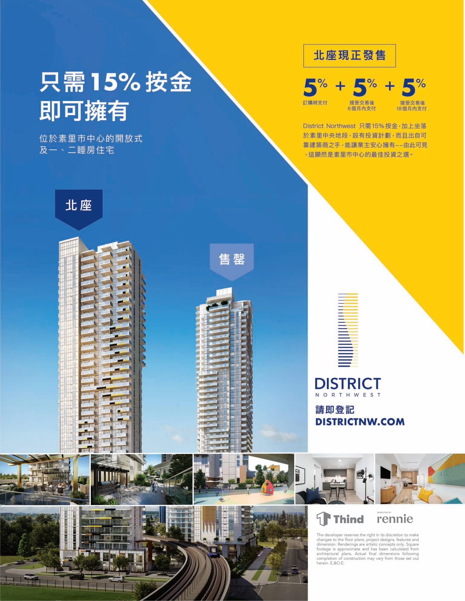56 MingPaoPropertyGoldPages 2022 年 9 月 29 日 明報地產金頁 可即入住 輕鬆擁有 冷暖空調 更加寬敞 特大戶型住宅 信步至天車站 步行到社區公園 步行到日托中心 住客專用設施 親臨,參觀及選購 列治文全新華廈 可即入住 典雅 風采 卓約 高貴 時尚 售價由 $60 餘萬起 3328CarscallenRoad,Richmond HazelbridgeatSexsmith,Richmond 每天 12 時至 5 時(星期五除外)請預約到訪
