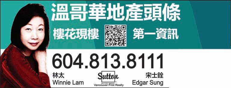 22 MingPaoPropertyGoldPages 2022 年 11 月 24 日 明報地產金頁 1stWestRealty JeanieHo 何 駿 穎 TEL:(604)783-0859 (國 , 粵, 英語) EMAIL:jeanie@sutton.com 免費估價,歡迎諮詢 B.COMM PersonalRealEstateCorp. 1502-833SeymourSt. 溫市中心 $699,000 CapitolResidence 位於市中心 最佳位置。1 房加書房 580 呎。數 分鐘即到天車站和加拿大線站、 金融中心和多個購物中心。高質 打造,捲簾,軟關閉廚櫃,燃氣灶, 花崗岩檯面,新地板和油漆。一流 設施,包括健身中心、休息室和禮 賓服務。現有租客,請 24 小時通 知約看。 9708HarrisonSt.Chilliwack ChilliwackProperWest 區。優美安靜匙圈 內街,佔地 56x110。1837 呎 4 房屋,全裝修 地下室,2016 年全面翻新,最近新換仿木地 板和新浴室。(2016)屋頂,帶花崗岩櫃檯和 不鏽鋼電器的新廚房,新浴室也有步入式 淋浴和花崗岩櫃檯,熱水箱,內外設計師油 漆。地下室大型娛樂室和獨立入口。全圍欄 的院子有獨立車庫和獨立儲藏小屋。孩子 們有很多空間。購物和生活便利。請提前 24-48 小時通知約看。 $999,000 105-8240Lansdowne 列治文 #1303-612SixthSt 新西敏 $699,000 新盤 新盤 #4-7533TurnillSt. 列治文 列治文最受歡迎的 McLennanNorth 區, 由 Adera 高質建造,清靜朝南,室內超過 1500 呎,開放式設計。 共 3 睡房、家庭房、 客廳和 2.5 間浴室。 樓下有巨大的辦公室/ 娛樂室,可用作另一間臥室。超大私人後花 園。廚房有島桌櫃、不銹鋼電器和花崗岩櫃 檯。廚房外的平台可享受夏日燒烤樂趣。單 車庫和有蓋停車位。大量訪客停車位和 TurnillStreet 上有大量路邊停車位。 靠近 購物、學校和交通。 $1,228,000 新價 商業租盤 新盤 #2101-2088MadisonAve 北本拿比 新盤 $849,000 10811BonavistaGate 列治文 $1,620,000 新盤 列治文 Steveston 北區 North 7,068 呎街角地,潛力 無限。1,924 呎 4 房和 3 浴室 獨立屋。Dienfenbak 小學和 Boyd 中學校區。40 分鐘車程 到 UBC 和 55 分鐘到 SFU。 1350WilliamStreet 溫東 出租$25/呎+NNN 工商業新盤 溫東黃金地段工業大廈。沿 William 街人 流,輕鬆連接所有主要交通路線、港口和 市中心。3,115 呎可出租面積。靈活間隔, 非常適合倉庫、配送中心、藝術工作室 等。基本租金為 $6490/月,總租金為 $8990/月。設辦公室/陳列室/倉庫區,正 層前面有開放式接待處,二樓有 3 間私人 辦公室,午餐室。裝載區。4 停車位。 #3085-4000 號 3 路列治文 商舖新盤 $429,000 列治文時代廣場 334 呎舖位。 人流量大,接連時代坊和加拿 大線天車站。位於列治文中心 黃金地帶。適合創業或投資。 近美食廣場最旺位置。 LEASED LEASED LEASED LEASED LEASED LEASED LEASED LEASED LEASED #62-10111SwintonCres 列治文 EdgemereGarden 罕有寬大明亮開放式 朝南的 2 層式共 1485 呎城市屋,超大後院 和帶圍欄的私人平台花園。非常安靜和安全 的環境。保養良好整潔舒適,設仿地板,燃氣 壁爐。近車站,Ironwood 購物中心、餐廳、 SouthArm 社區中心和公園。步行 10 分鐘 到 ThomasKidd 小學,13 分鐘到 McNair 中學(步行 10 分鐘)。容易約看。 新盤 A119AllianceonVanguard 位於列治文中心路段, Shell 夾 Alderbridge 最理想位置,全新工商業大 樓於 2022 年底落成。共 3247 呎,正層 2295 呎加樓上 952 呎。22 呎高樓底, Grade1 卸貨區,高效 LED 照明系統,三 叉電,每個單位均有洗手間喉管接駁,大 量停車位及自然彩光充足。鄰近高速公 路和到達大溫地區的多條橋樑。附近眾 多工商業丶食肆和公車站。 出租$25/呎+NNN SOLD SOLD SOLD SOLD SOLD SOLD SOLD SOLD SOLD SOLD SOLD SOLD SOLD SOLD SOLD SOLD SOLD SOLD SOLD SOLD SOLD #805-3333CorvetteWay 列治文 新盤 $549,000 $779,000 工商業新盤 SOLD SOLD SOLD SOLD SOLD SOLD SOLD SOLD 2233ScarboroAve 溫東 溫東 Fraserview 黃金地段。佔地 45x135.52。 3 層屋共 3,585 呎,寬敞明亮,上層有 4 房,正 層有 1 房和書房,地下室獨立 2 房單位。朝南 有景和多個天窗,自然光充足。並排雙車房, 大量存儲空間。位置便利,有安全大門和圍欄 庭院,靠近高爾夫球場、購物和交通,5 分鐘 到小學。適合大家庭或投資! 需 24 小時通知 約看。 新盤 $2,533,000 H.LYDIAHSUPREC* 電郵:lydiahsu@shaw.ca 604-644-0778 LYDIAHSU 許小姐 國、粵、滬、英語 新盤 1002-1311BeachAve,Vancouver $1,698,000 位於溫哥華著名的 TUDORMANOR,一覽無餘的英 吉利灣無敵海景及日落美景。1,088 呎寬敞一間臥室 ,書房,1.5 浴室,朝南陽台。裝修精美的開放式廚房 和主人套間。一個車位及大儲物櫃。高級公寓有 24 小時禮賓服務,客人套房,歡迎寵物。請預約參觀。 EdisonChua P.R.E.C. 604-728-1939 edison@edisonchua.com www.vancouversmartrealestate.com 1stWest 徵求:樓市暢旺!如欲出售閣下物業,請致電免費評估物業! 蔡 尚 輝 列治文 Penthouse 角 落 3 房 2 浴室, 帶環繞陽台,新 落成 Cascade City,2 個並排 停車位和儲物 櫃。頂級電器。 1138 呎私人屋 頂平台! 新盤 #304-8138FraserSt. #1805-5788GilbertRd $538,000 $1,490,000 溫東 Fraser Commons 全 新 Studio 單 位。落地窗。 設施包括屋 頂平台、禮賓 服務、健身中 心等。包 1 存 儲空間。 新盤 $1,088,000 $850,000 #2803-89NelsonSt. MLS#R2719467 MLS#R2678308 MLS#R2673536 新盤 $999,000 #211-37842ThirdAve. 寬敞 1,418 呎 3 房和 2.5 浴室城市 屋。490 呎私人屋頂平台秀麗山景 。享受大自然又步行到 Aquamish 市中心便利設施。2 儲物櫃和仿如 全新屋,尚餘 2-5-10 保養。 MLS#R2694059 #13-7311MinoruBlvd. 列治文 4 房 3.5 浴室城 市屋,1849 呎左右雙車 房,好校區。 SOLD SOLD SOLD SOLD SOLD SOLD SOLD SOLD 減 新盤 MLS#R2721228SOLD SOLD SOLD SOLD SOLD SOLD SOLD SOLD SOLD SOLD 網