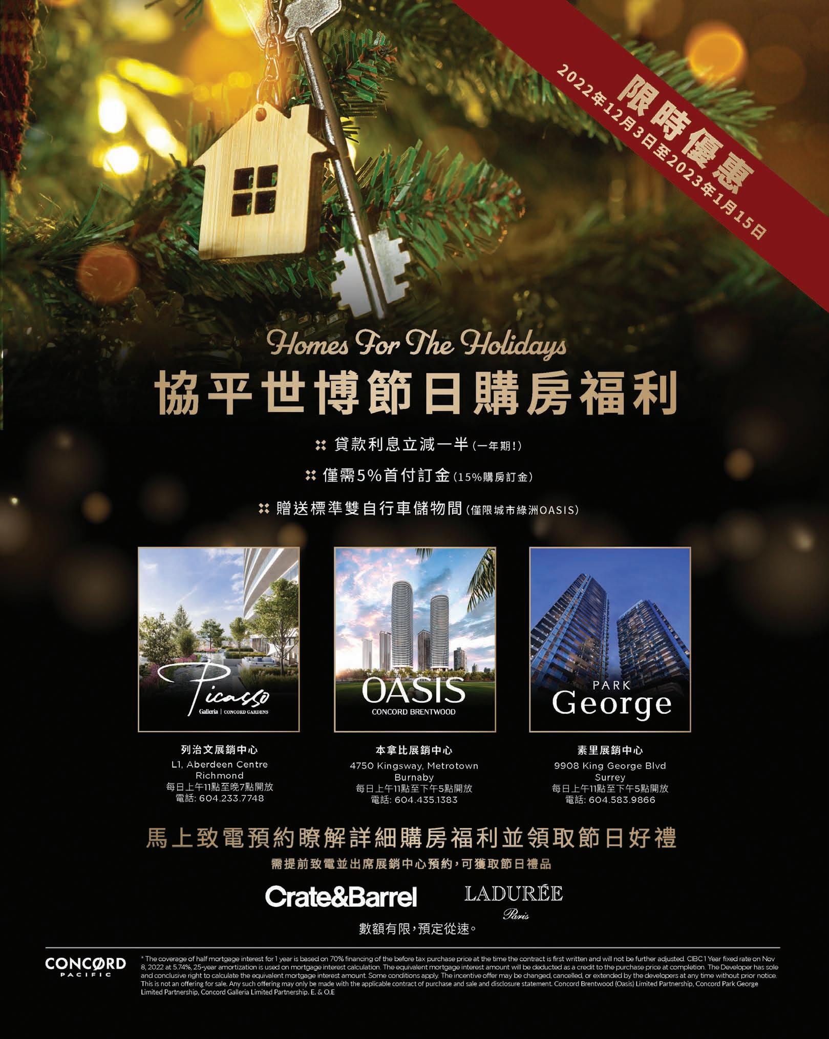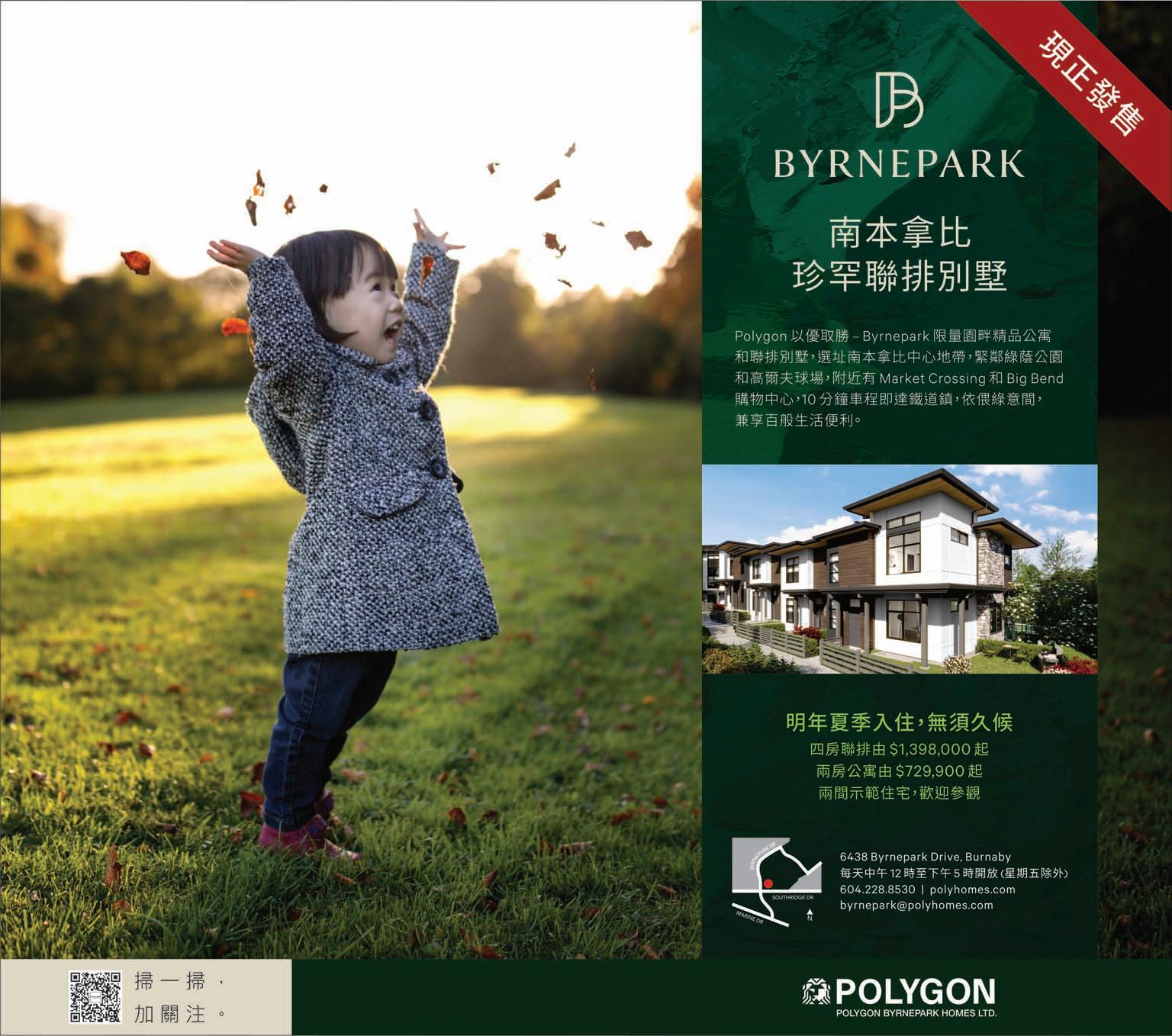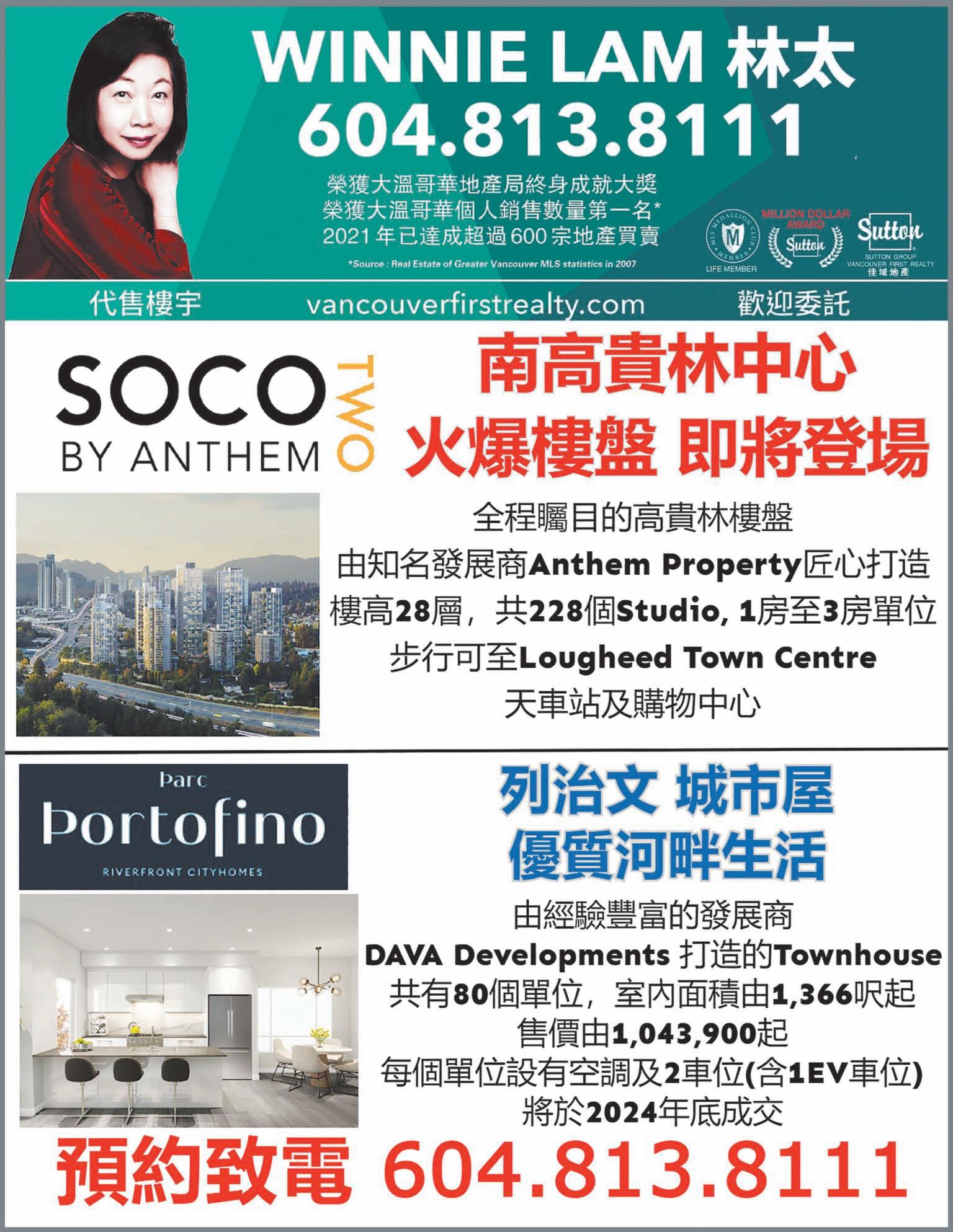 14 MingPaoPropertyGoldPages 2022 年 12 月 8 日 明報地產金頁 擁有大量實力買家和強大銷售網絡,銷售特好特快,口碑載道。發展商樓盤代理之典範! www.LDGPROJECTS.com | 聯絡電話:604.267.7066 LDGProjectMarketing 發展商樓盤代理 THEGRAYSON SOLDOUT 售出 SOLDOUT 售出 BUTTERFLY BASALTATCAMBIE SOLDOUT 售出 APERTUREAT41ST SOLDOUT 售出 HAWTHORNE SOLDOUT 售出 SECOND+MAIN SOLDOUT 售出 LDGProjects 成功售出發展商樓盤 歡迎各位發展商委託銷售樓盤, LDGPROJECTS 團隊是最好的選擇! CentralLivingSurreyCentral 寧靜公寓社區 全新豪華公寓 www.central-living.ca 新盤 超級撿漏投資機會—西區全新公寓買 5 送 1 總標價$11,000,000 新盤 發展商預留的最後 6 套新頂層及次頂層 公寓,位於西區最佳黃金地段渥列治 OAKRIDGE 與 女皇公園 QEPARK 附 近,每戶面積大約 1400 呎,按目前附近同 類型的樓盤樓花銷售的市場價大約 $1600/呎,平均每戶市值在 $2,200,000 以上,總價值 $13,200,000。現發展商急 需套現,誠徵有實力投資人一次性全部購 買,打包銷售按 8 折優惠,最低按 $1280/ 呎虧本價出售,總標價 $11,000,000,相 當於買 5 套免費送一套大公寓!!! 渥列治及女皇公園附近黃 金地段,性價比超值投資! 目前租金大漲,每戶租金可 達 $6000/月,投資這 6 套 公寓每年總回報達 40 萬加 元,回報率接近 4%,可自 用也可全出租,待幾年後渥 列治商場重建完成後,升值 空間巨大!!! 先到先得! 發展商預留少量單位公開發售 SAVOY 西區甘比走廊全新豪華栢文 Savoy 位於溫西蓬勃發展並極具潛力的 Cambie 走廊夾 26 街 的核心地段,信步可達著名 QE 女皇公園,距離 KingEdward 天車站只有數步之遙,交通便利,前往溫哥華市中心、列治文 或機場都非常快捷。鄰近 Oakridge 購物中心、Cambie Village 商鋪餐廳,Hillcrest 社區中心等,生活十分方便。附近 多間頂級名校林立,是非常適合家庭居住的社區。 這棟六層高的全水 泥結構大樓提供 64 套精心設計的 Urban-1、1、2、3 臥室公寓與城市住宅,配備空調。享受奢華 都市生活與大公園自然環境。發展商預留少量單位,請即與 LDG 團隊聯絡查詢,電話 778-883-7366。 新盤 最理想素里市中心 寧靜公寓社區 別具特色的 一睡房、二睡 房和三睡房豪華公寓 CentralLiving,位於素里市中心 最佳地段寧靜內街,讓您感到活 力澎湃,鬧中取靜,附近各式商 店、餐館林立,鄰近多個公園和 各級學校。生活所需盡在步行範 圍,無需駕車非常方便。距離素 里市最大的中心商場僅百餘米, 中心公園一百米左右,跨過公園 就是天車總站,左邊緊臨 SFU 學校,右邊緊靠 UBC 素裡校址, 距市政府步行僅數分鐘。 ŌkuPre-sale 預售! 溫西 Marpole 區打造全新地標 新盤 ōku 坐落在溫西 Marpole 區,位於 64 街與 OAK 街交界處,交通生 活便利,頂級名校林立。溫西罕有 混凝土中央空調高端公寓項目, 純住宅式公寓,閙中取靜,隔音效 果出眾。戶型從開放式、一睡房、 兩睡房到三睡房均可滿足不同人 群對於居住空間的要求。秉承可 持續“零排放”環保理念,踐行綠 色建築設計,其建築標準嚴格 “LEEDGOLD”黃金認證。 ōku 溫西 Marpole 區一系列開放式、 一睡房至三睡房單位