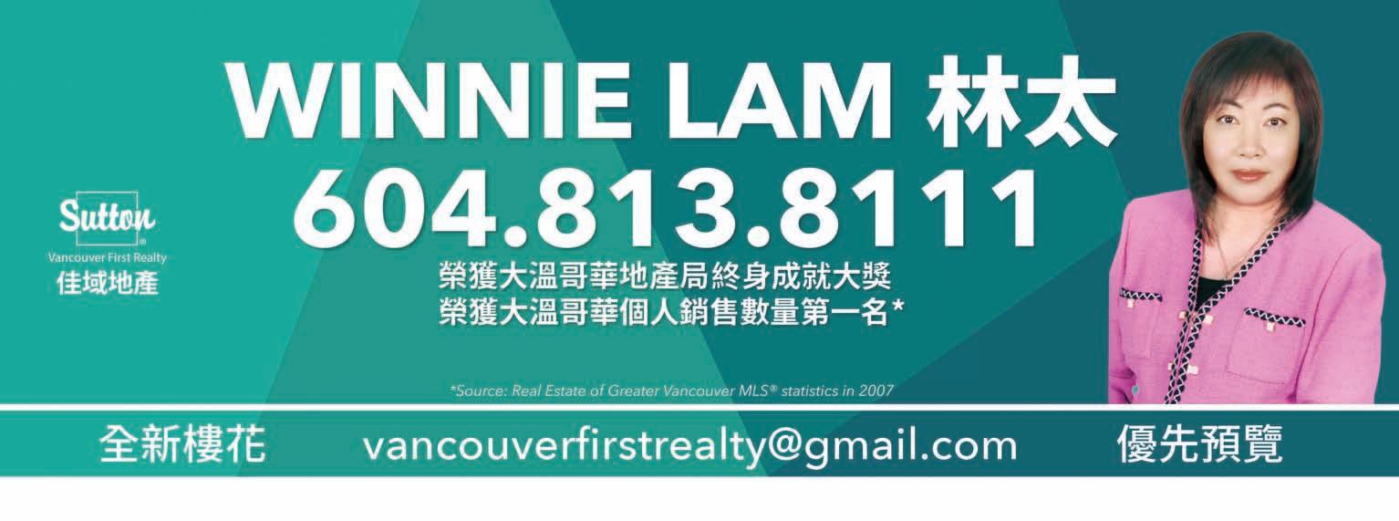 46 MingPaoPropertyGoldPages 2023 年 1 月 19 日 明報地產金頁 RebeccaNg PersonalRealEstateCorp 604-603-7378 email:info@rebeccang.com www.rebeccang.com 精通國﹑粵﹑英語 服務至上 信心保證 15 年專業地產顧問 值得您信賴 榮獲 RegentParkPresident GoldAward 地產局 MedallionClub Award RegentPark FairchildRlty. Off:604-606-8188 ConcordHillsideBurnaby $1,088,000 本那比 ConcordHillside 鄰近 BrentwoodMall,天車站,交通方 便,中層 2 房 2 廁 860 呎向東單 位,包一車位,2024 年中人伙。 無敵海景 SOLD SOLD SOLD SOLD SOLD SOLD SOLD SOLD SOLD SOLD SOLD SOLD SOLD SOLD SOLD SOLD SOLD SOLD SOLD SOLD SOLD SOLD SOLD SOLD SOLD SOLD SOLD SOLD SOLD SOLD SOLD SOLD SOLD SOLD SOLD SOLD IN1WEEK IN1WEEK IN1WEEK IN1WEEK 790FairmileRd.,WestVancouver $9,680,000 TH25-338JervisMews,Vancouver $3,788,000 1341WhitbyRd.,WestVancouver $6,980,000 2328MathersAve.,W.Vancouver $2,490,000 1433W.53rdAve.,Vancouver $3,450,000 1528W.57thAve.,Vancouver $2,180,000 9793StevestonHwy,Richmond $1,328,000 SOLD SOLD SOLD SOLD SOLD SOLD SOLD 9662ShieldsAve.,Richmond $1,550,000 SOLD SOLD SOLD SOLD SOLD SOLD 樓花轉讓 白石鎮豪華 sub-penthouse 單位 ,無敵海景,東南北朝向,室內約 1925 呎,特大雙陽台共約 880 呎 ,雙車位,大約 2023 年夏天入伙。 樓花轉讓 減 西區 SouthGranville 尊貴豪宅,街角地 72’x173’, 風水靚屋 5627 呎,5 房+書房,6 ���� 廁,中西廚房,電 影院,健身房,中央冷氣,地熱,中央冷氣,精美庭園 ,地點一流,名校林立,低於政府估價,良機勿失! 6311ChurchillSt.,Vancouver$7,380,000 超值筍盤 #11-5651LacknerCres.,Richmond $1,238,000 SOLD SOLD SOLD SOLD SOLD SOLD SOLD SOLD #202-6651MinoruBlvd.,Richmond $528,000 新盤 列治文市中心東南角 1255 呎特大 2 房,2 廁,一室內車位,儲物室,室外泳 池,健身室,交通方便,步行至天車、 公車、購物中心、公眾圖書館、泳池、 社區中心,請約看! 620St.AndrewsRd.,WestVancouver$8,880,000 地 12,622s.f. 海景豪宅 新盤 西溫 BritishPropities 海景豪宅,8689 呎, 特大 6 套房 + 客房,3 車房,電影院,健身 房,特大花園精心設計,美輪美奐,享受美 麗景色! SOLD SOLD SOLD SOLD SOLD SOLD SOLD SOLD SOLD SOLD SOLD 1 1 1 1 1 1 1 1 1 1 個月內售出 個月內售出 個月內售出 個月內售出 個月內售出 個月內售出 個月內售出 個月內售出 個月內售出 地址:5368ParkwoodPlace,Richmond,BC,V6V2N1 I 電話:604-231-8992 I www.MingPaoCanada.com/Van 副刊多元化 令您生活更豐富