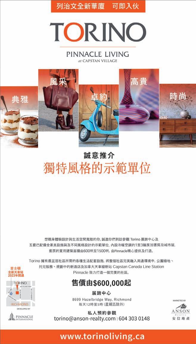 2 MingPaoPropertyGoldPages 2023 年 2 月 2 日 明報地產金頁 604-275-9787 樓盤及室內照片請瀏覽網頁 www.patsyhui.com 35年大溫地產局終身成就獎 Life Member 精英˙專業 許 太 PATSY HUI 超群˙卓越 列治文市中心罕有 低密度特大 高級柏文 靜中帶旺 + 最靚最寬敞圖則 + 可即入住 著名意大利建築商Quorum Group承建 ˙開放式光猛設計 ˙間隔寬敞 ˙中央冷暖氣 ˙高級建材 ˙寧靜內街 ˙交通方便 ˙近市政廳 ˙購物中心 Team President's Award President's Club Diamond Master Medallion 現樓銷售中心 列治文 6833 Buswell Street 預約查詢請即電 Patsy Hui (許太) 604-275-9787 或 778-924-0989 網上瀏覽及登記 LiveAtPrima.com 電郵 : sales@liveatprima.com
