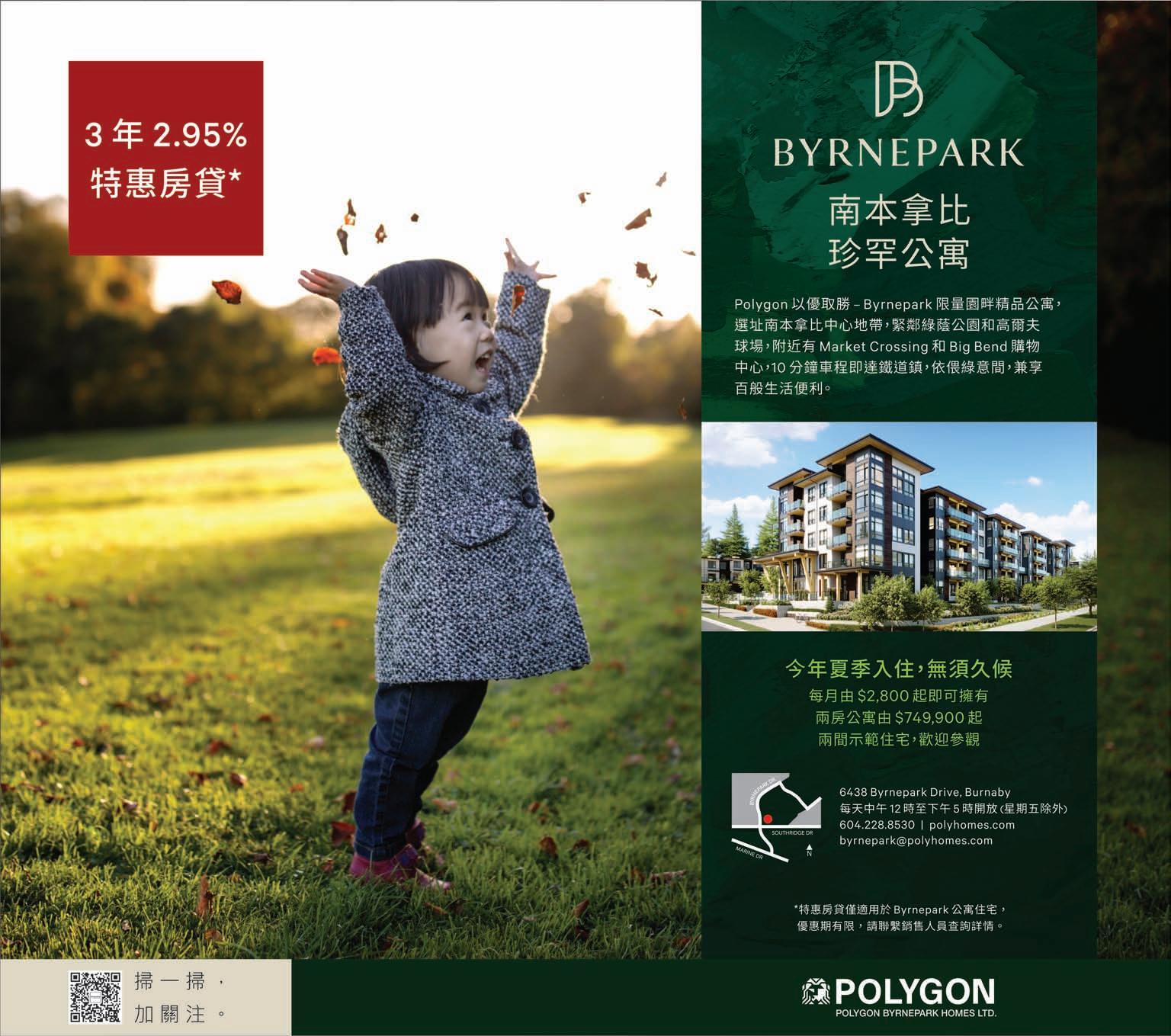 501-3355 Binning Road, Vancouver UBC區內2016年Polygon發展/承 建豪華22層大廈。1330呎兩房 (或三房)兩廳兩套廁+書房,近百 呎向西南有蓋露台,開放式設計 光猛寬大,落地大窗,天然氣煮 食爐、冷暖氣、木地板等。一手 業主,保養一流,有兩保安車位 地下儲藏櫃單車位。會所設施包 括運動及瑜伽室、派對房、圖書 館等。 售價$1,688,000