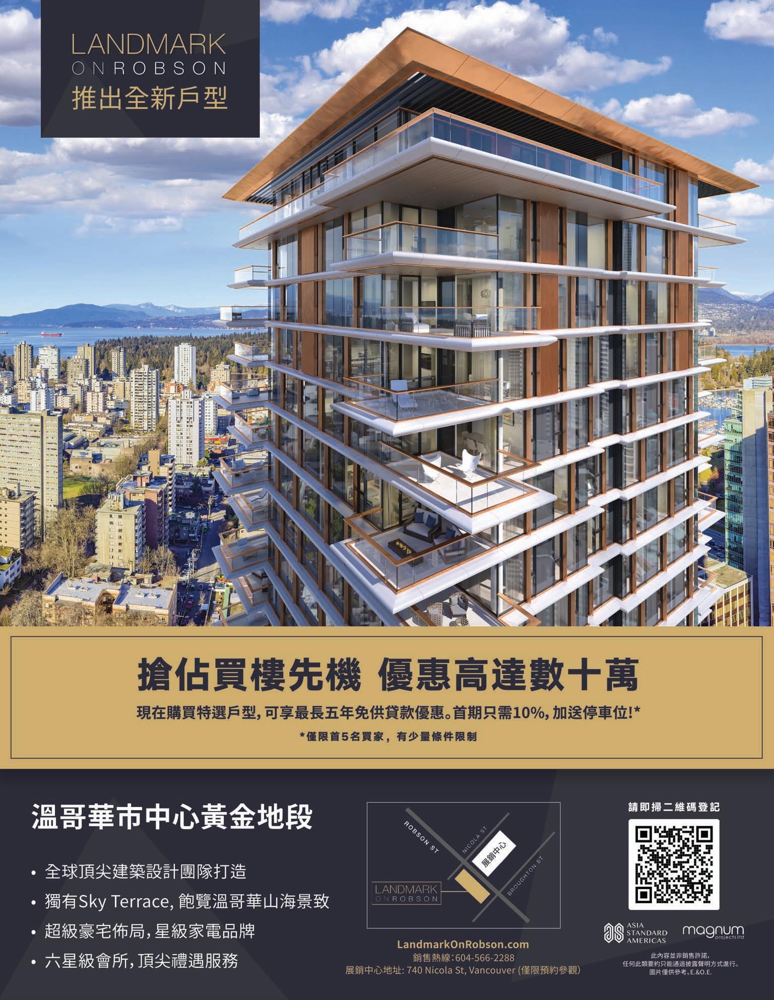 溫哥華市中心 著 名新地標項目,坐落於 Nelson 與 Burrard 街口,溫哥華市中心最高點, 獨享城市美景。今年底入夥高層公寓,西南角 2 房 2 衛共 1214 平 方 呎,開 陽 向 南 大 客 厅 及睡房。由北美首屈一指的開發商 Westbank 打造,名設計師 BingThom 獨特風格設 計,充滿未來感的外觀猶如展翅的蝴蝶。室內金色內飾,盡顯奢華格調。高級建材配名牌 電器,空調系統,實木地板,這層樓更設有獨特的開放式花園。大樓提供 24 小時禮賓服 務,設備齊全健身中心、瑜伽室、休閒區、奧運會級別泳池、按摩池、桑拿室、狗隻清潔空 間,並配有數輛寶馬汽車和寶馬自行車供業主獨享,2 車位。稀缺高端樓盤,機會難逢!