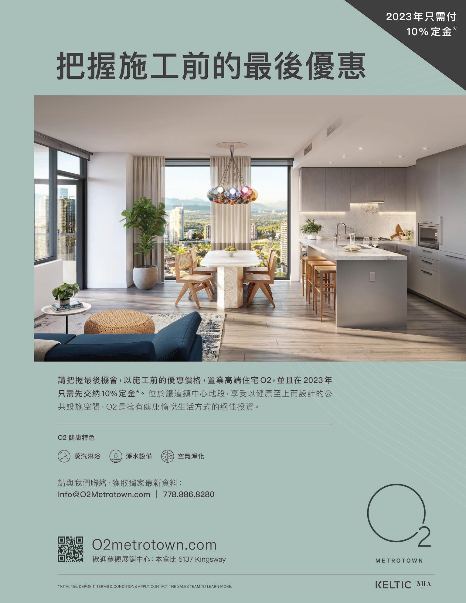 溫哥華市中心 著 名新地標項目,坐落於 Nelson 與 Burrard 街口,溫哥華市中心最高 點,獨享城市美景。今年底入夥高層公寓,西 南角 2 房 2 衛共 1214 平方呎,開陽向南大 客 厅 及 睡 房。由 北 美 首 屈 指 的 開 發 商 Westbank 打造,名設計師 BingThom 獨特 風格設計,充滿未來感的外觀猶如展翅的蝴 蝶。室內金色內飾,盡顯奢華格調。高級建材 配名牌電器,空調系統,實木地板,這層樓更 設有獨特的開放式花園。大樓提供 24 小時 禮賓服務,設備齊全健身中心、瑜伽室、休閒 區、奧運會級別泳池、按摩池、桑拿室、狗隻 清潔空間,並配有數輛寶馬汽車和寶馬自行 車供業主獨享,2 車位。稀缺高端樓盤,機會 難逢!
