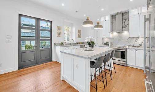 豪宅 2016 年建成,由專業設計師量身度造,獨特的地中海式建築,豪華中透着海的陽光及 清新,在近海的 StevestonNorth 區,尤其相得益彰。以 16 呎 4 吋的超高樓底迎賓,盡顯奢華, 同樣高樓底的客廳及餐廳採開放式設計,水晶燈飾從圓頂天花板垂下,陽光從大面積玻璃窗 灑入,特別寬敞明亮。廚房以核桃色訂製廚櫃配上淺色石枱面,雅緻大方,不僅全採用高級品 牌電器,兩具超大型不鏽鋼冰箱,及中、西式廚房設計,滿足女主人所有的烹煮需求與想望。
