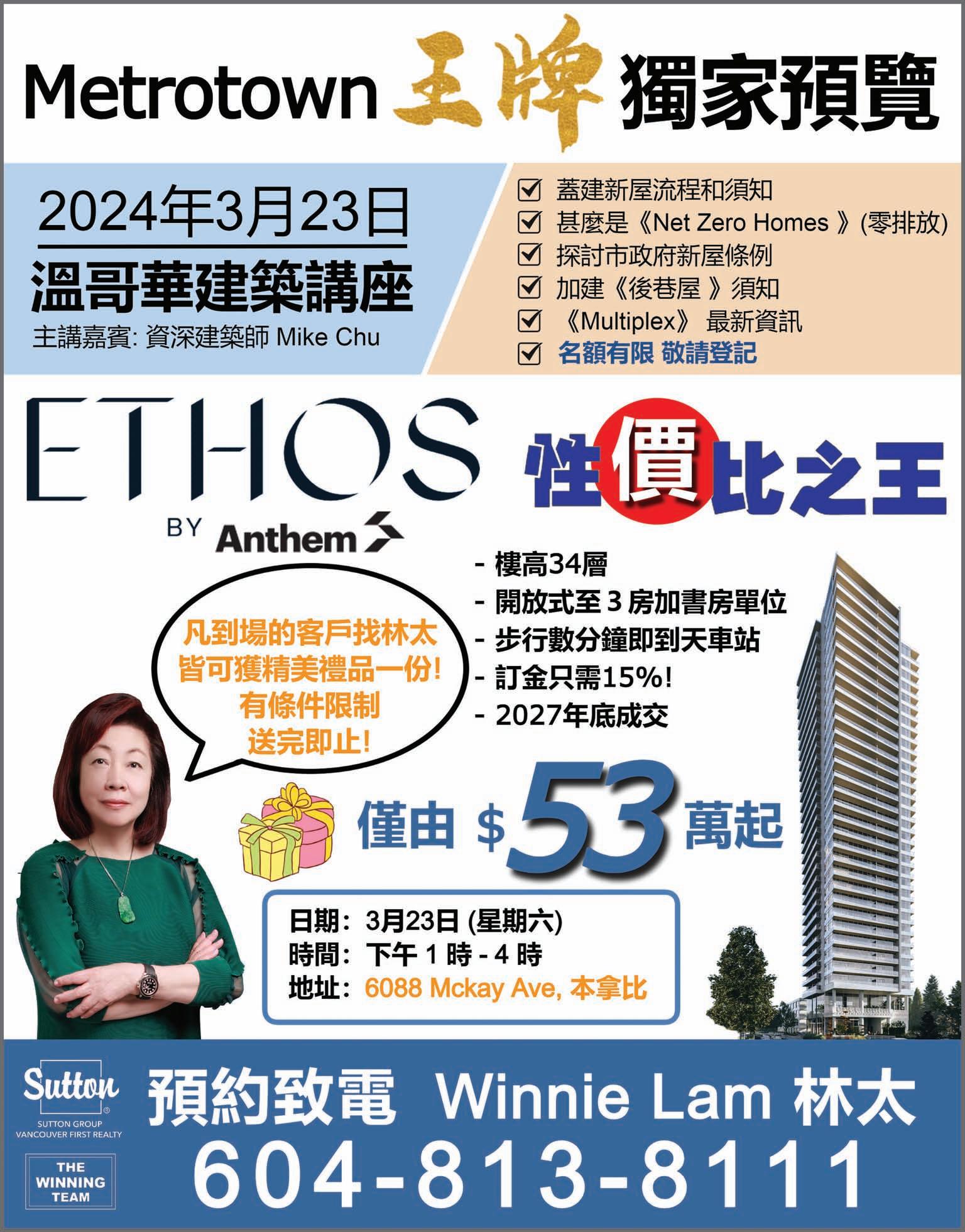 協會首席經濟師奧格蒙森(BrendonOgmundosn) 說: 「卑詩房屋市場現屬於一個相對較淡靜的時期來進 入春季。當市場活躍程度回升,房屋銷售仍會較正常 低,房價自去年夏季以來一直主要是平穩。」