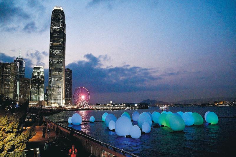 添馬公園延伸至維港海面站立了逾200個3至5米高的「發光蛋」(ovoid),發出絢爛光效。