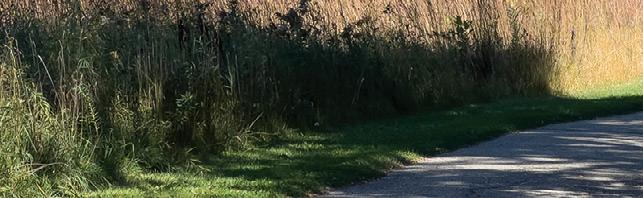 snakes through Lake Louise State Park and on to LeRoy, where it ends after 28 miles. Our itinerary for the day was a ride to Rose Creek and back, followed by a walk at the nature center. We left Austin behind and rode through the open country on a wonderfully sunny day. The flat trail made the going easy, and the light headwind didn’t bother us because we knew the reward was coming on the return trip. Combines were bringing in the last of the summer harvest, sending dusty plumes into the air. Fall was knocking, but we didn’t think about that at all. Our legs were good, the pedals turned effortlessly, and we chatted away as we usually do on our bike rides. Eighteen miles later, we were back, but not quite done yet.
