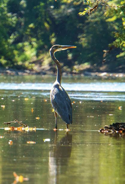Dam. It was removed in 1936; its only remnant was a yellow brick building on the east bank. With the city behind us, the sounds turned more natural, and we spotted a great blue heron when we came around a bend. Our journey ended when we reached Riverwood Landing near Austin’s Sola Fide Planetarium.