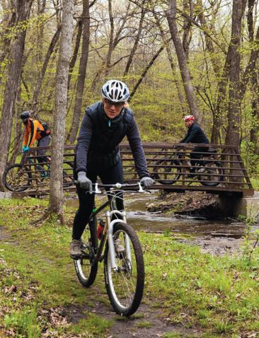 AT ABOUT THE SAME TIME, THE CITY DEDICATED A MOUNTAIN BIKE TRAIL SYSTEM, AND KIDS STARTED JOINING THE HIGH SCHOOL MOUNTAIN BIKE TEAM IN DROVES. AUSTIN WAS NOW SOLIDLY IN TRAIL TOWN TERRITORY, BUT THIS TRANSFORMATION ACTUALLY STARTED BEFORE THAT. IN 1911, THE MINNESOTA DEPARTMENT OF NATURAL RESOURCES MADE A STRETCH OF THE CEDAR RIVER THROUGH AUSTIN AN OFFICIAL STATE WATER TRAIL, AND THE JAY C. HORMEL NATURE CENTER HAS WELCOMED VISITORS TO ITS TEN MILE TRAIL SYSTEM SINCE 1975.