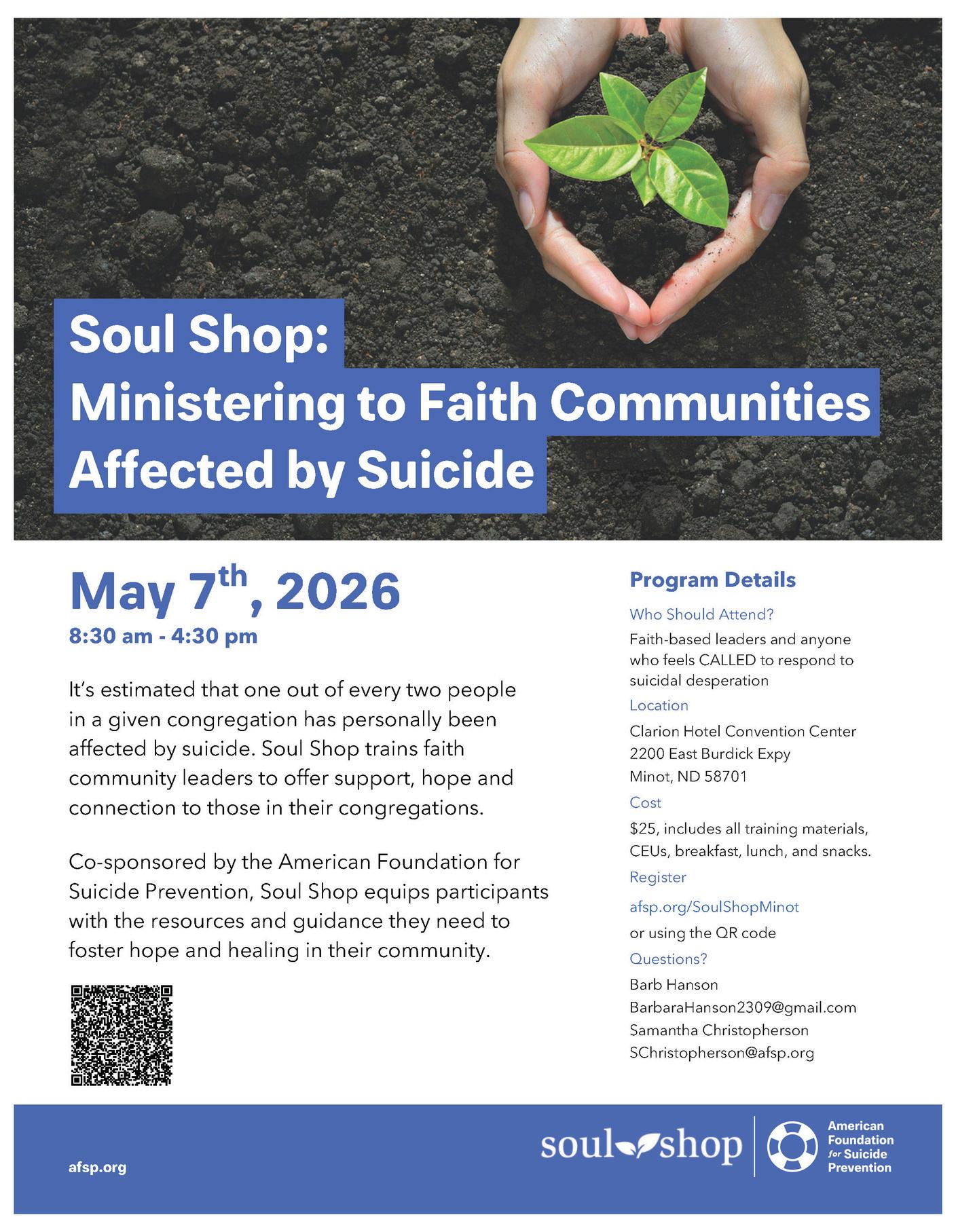 Registration is $25 per person, which includes all training materials, continuing education units (CEUs), breakfast, lunch, and snacks Those interested in attending can register online at afsp.org/SoulShopMinot or by using the QR code on the event flyer. For additional questions, contact Barb Hanson at BarbaraHanson2309@gmail.com or Samantha Christopherson at SChristopherson@afsp.org.
