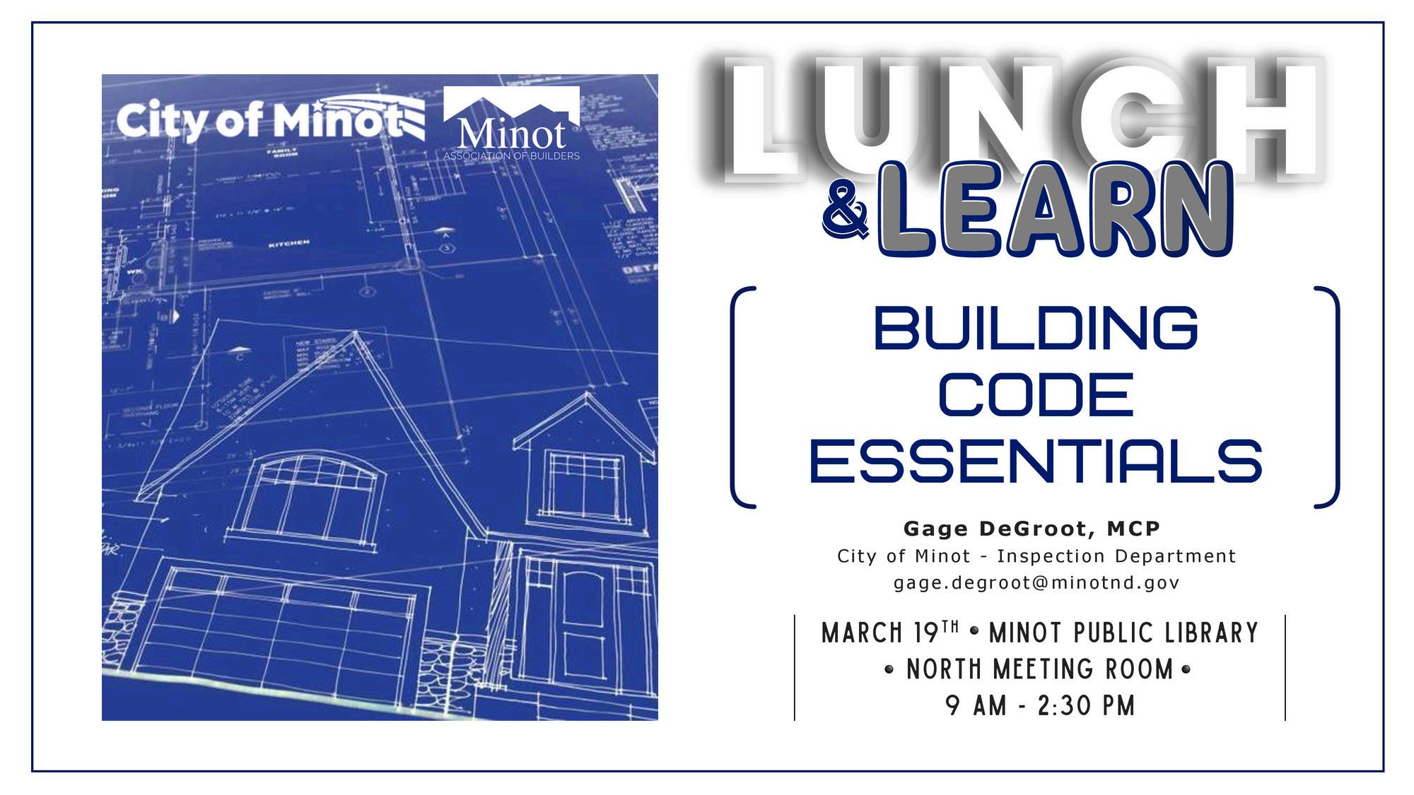 Join the Minot Association of Builders and the City of Minot on March 19 from 9AM to 2:30PM at the Minot Public Library’s North Meeting Roomfor a practical, no-nonsense Lunch & Learn focused on the fundamentals of local building codes, including the code changes recently adopted for 2026. Presented by Gage DeGroot, MCP, with the City of Minot, this session is designed to help builders, contractors, designers, and industry partners stay current and confident as new requirements take effect.