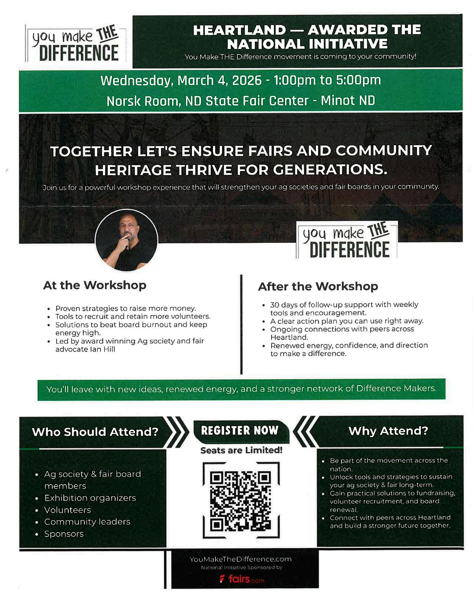 Local fair, ag, and community leaders are invited to a powerful professional development opportunity this spring as the You Make the Difference Tour makes a stop in Minot Hosted at the Norsk Room, ND State Fair Center, this high-energy workshop is set for Wednesday, March 4, 2026, from 1:00p.m.–5:00p.m. and is designed to motivate, inspire, and equip those who help keep fairs and community traditions thriving.