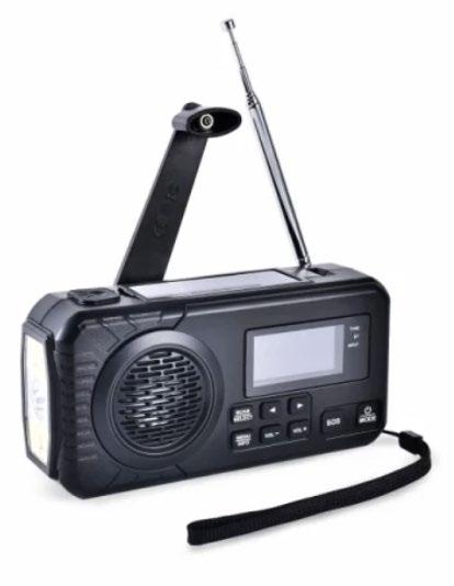 En DAB/FM nødradio som er ment til uventede situasjoner Radioen har et robust design med sammenleggbar antenne og en størrelse som enkelt passer i en ryggsekk Nødradioen mottar både FM og DAB-signaler, og kan også kobles opp mot bluetooth Den leveres med innebygd LED lampe (lommelykt), innebygd leselampe, innebygd powerbank på 5000 mAh, overfallsalarm, samt vekkerklokke alarm som stilles inn manuelt Når det gjelder radioens batterikapasitet har du fire valg: Lad ved å sveive, via solceller, med AAA batterier (ikke inkludert) eller via USB-uttak Ved strømbrudd en det enkleste å bruke sveiven eller de ekstra batteriene i tilfelle du raskt vil få opp batterikapasiteten Radioen har en USB utgang og en Type C utgang som kan brukes til å lade opp din mobil eller andre elektroniske produkter Kan logomerkes