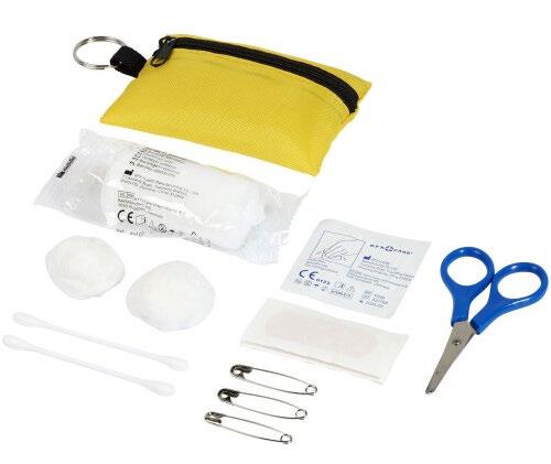 Praktisk polyesterveske med nøkkelring med 16 førstehjelpsdeler Settet inneholder en saks (9 cm), 2 hudrensepinner, 1 elastisk bandasje (4 meter x 6 cm), 2 bomullsballer (0,5 gr), 3 sikkerhetsnåler ( 3,6 cm), 5 plaster (45 x 19 mm), og 2 bomullspinner (8 cm)
