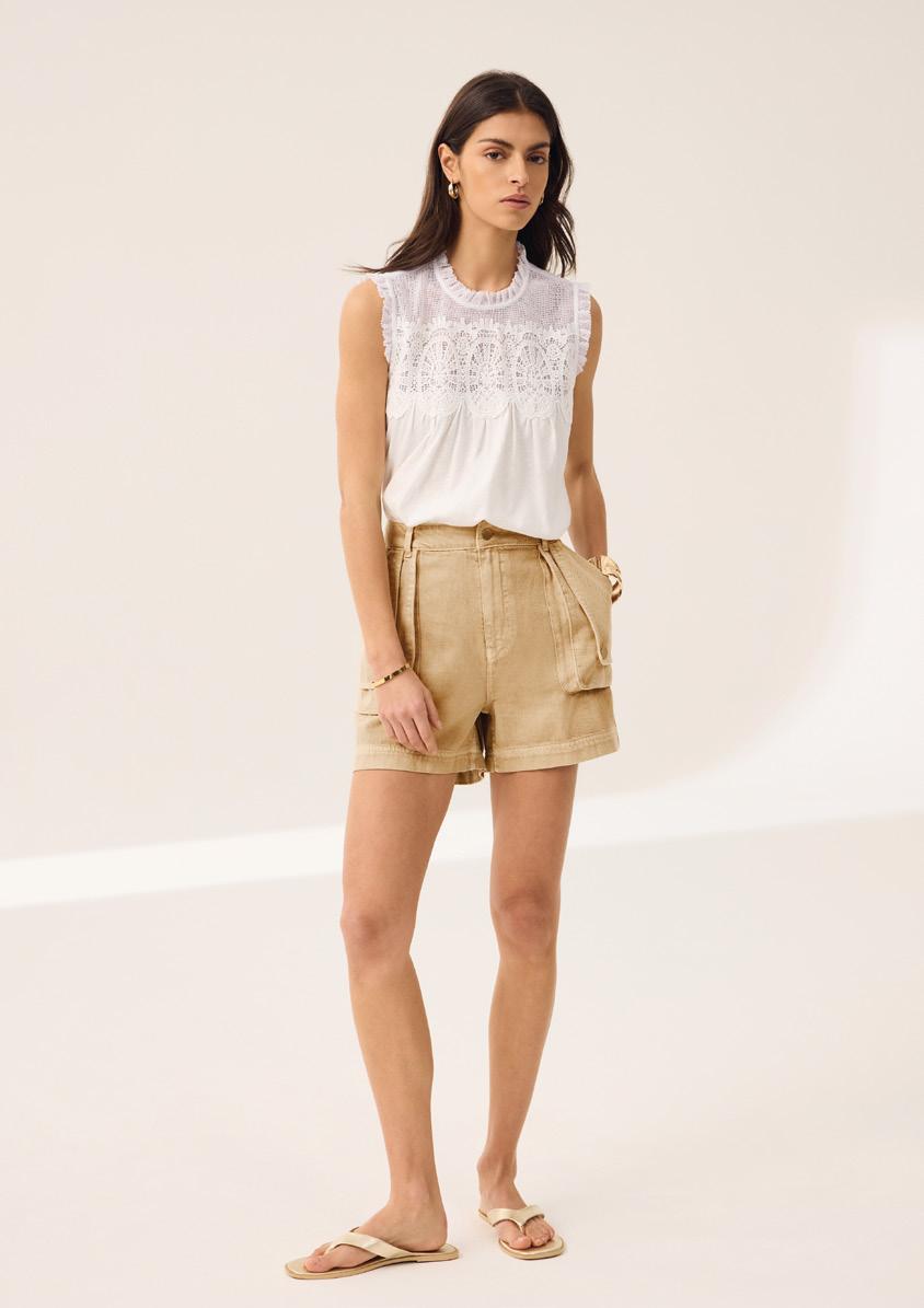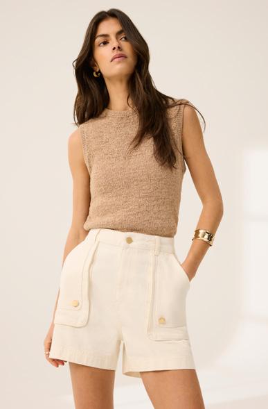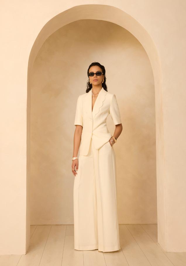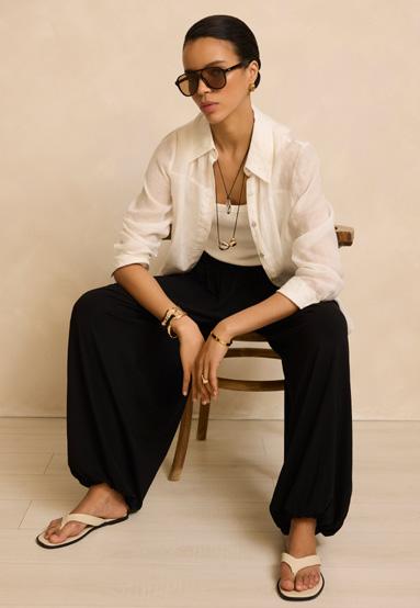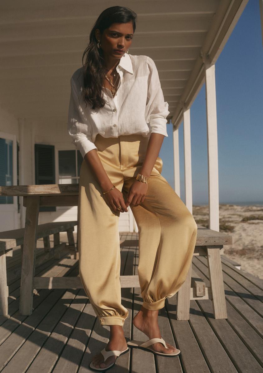 Trending shape: balance the volume of a balloon trouser and punch of metallics with fresh white linen. Pure Relaxed Glamour