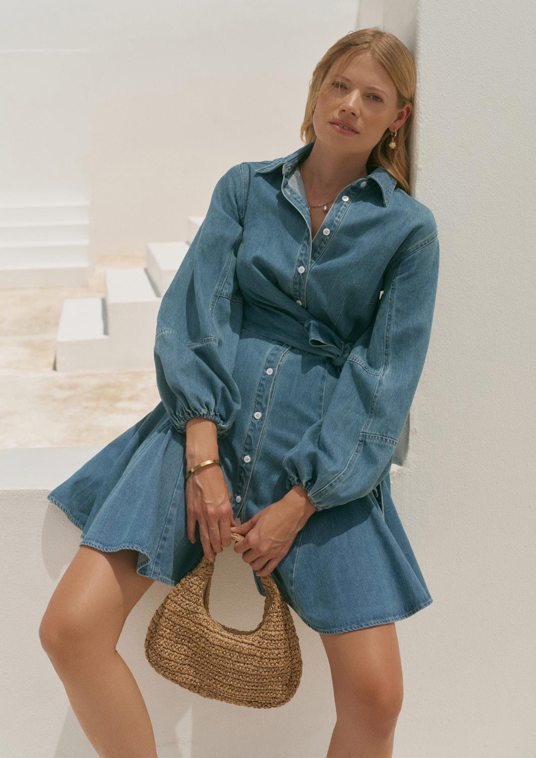 Playful puff sleeves and a shorter hemline make denim feel specialwith a side-tie to rein in the volume