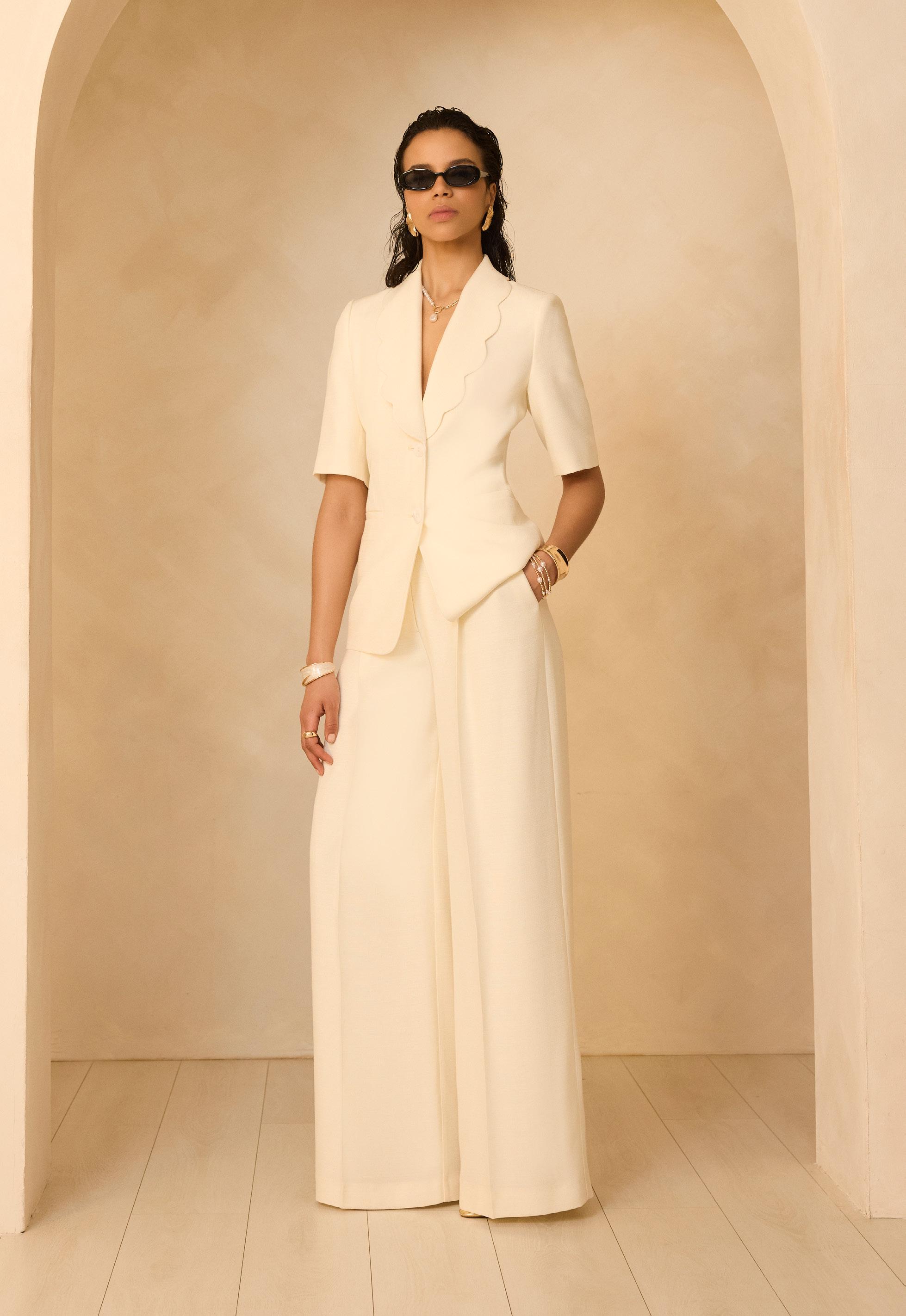 Spring’s key shape creates a lengthening line, while precise seam-work and scallop edges keep the top considered