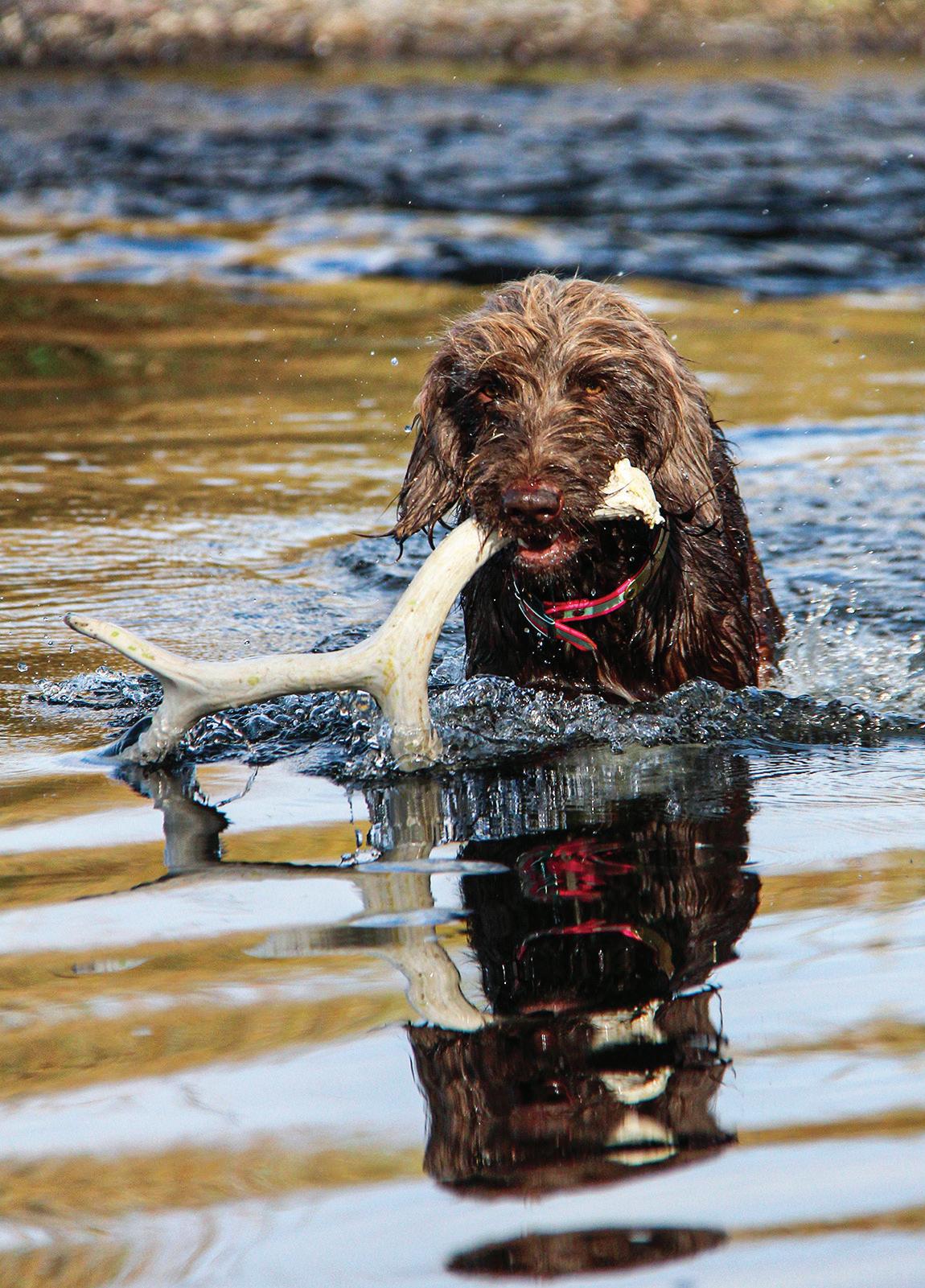 WHEN YOUR PUP is 8 or 9 weeks old, saw off an antler tine from a deer or elk rack and give it to the dog. Avoid giving the pup a big shed with multiple points, eye guards and burrs, as you don’t want the pup getting poked and having a bad experience.