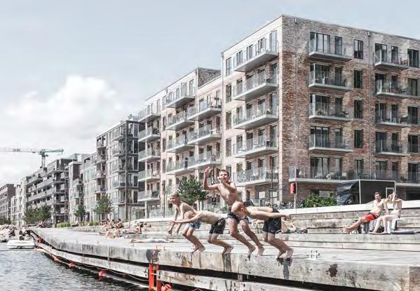 A ‘five-minute city’ of small hops be tween housing, work, day care, trans port, recreation and shopping amenities, Nordhavn actively champions journeys on foot, bike or public transport. Two Metro stations opened in 2020 and a ‘su per bikeway’ offers links to the city.