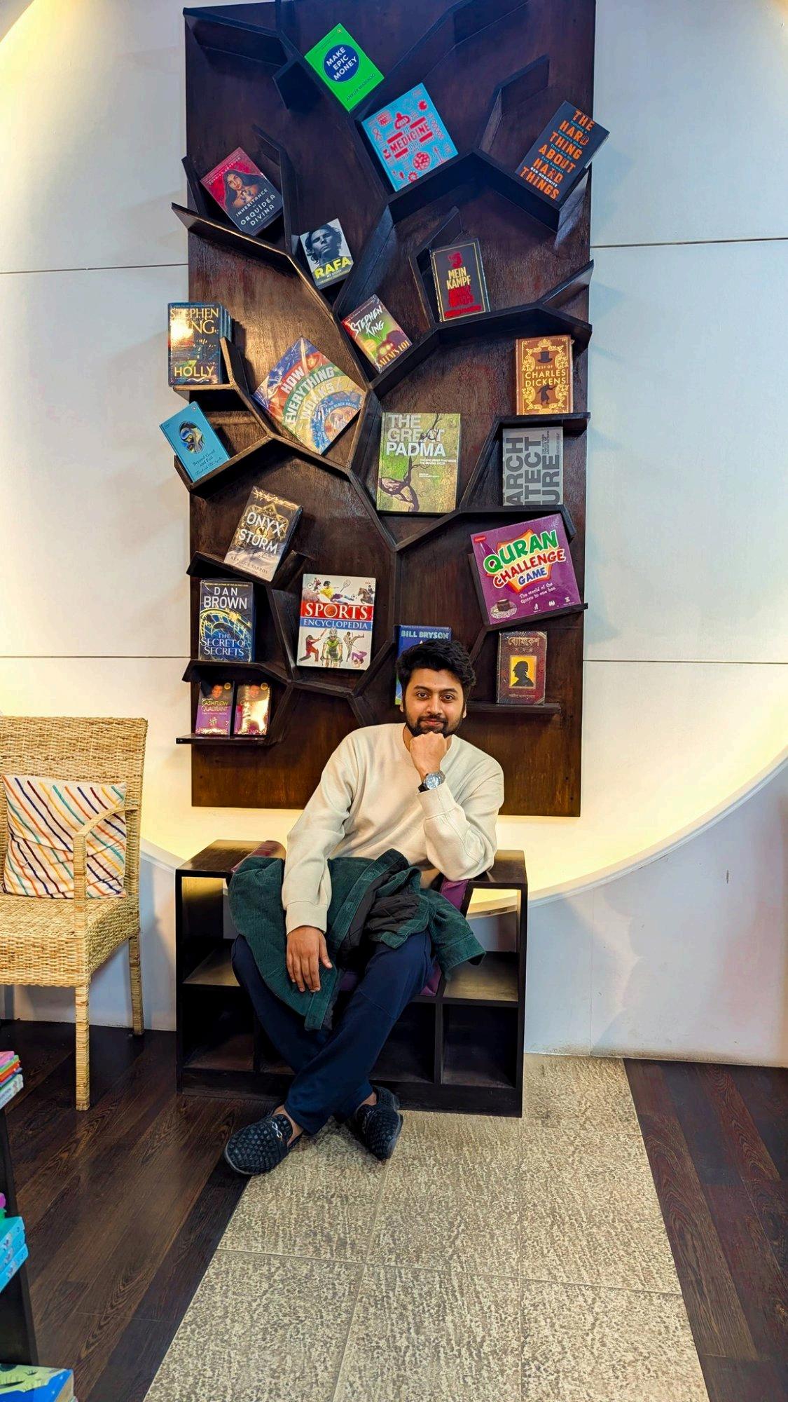 Islam photographed at a Dhaka bookstore His personal reading influences Stephen King visible among the spines behind him inform a body of work that bridges genre fiction and literary ambition 2