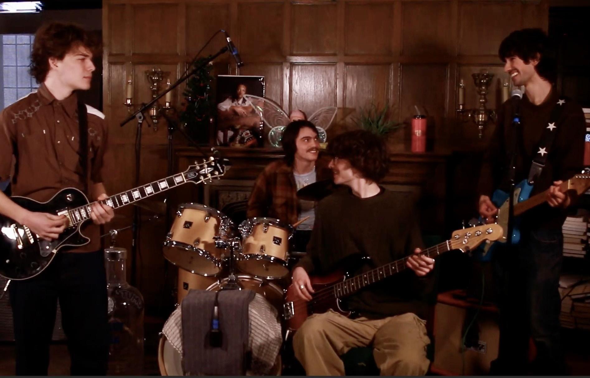 Anodyne, consisting of sophomores Elliot Evans [Disclaimer: Evans is a Copy Staffer for The Miscellany News], Nikolai Jerrard, Leo Kogan and Joey LaRosa, walked onto the set with a comically oversized vodka bottle and a giant paper sword, which—after play ful banter proclaiming they must shave their mustaches soon—they bestowed upon their drumset. Anodyne, a word they described as meaning “bland,” is an indie rock band aim ing to musically capture their college experi ence. Since meeting during their freshmen orientation, the quartet has experienced the fluctuations of surviving college with the