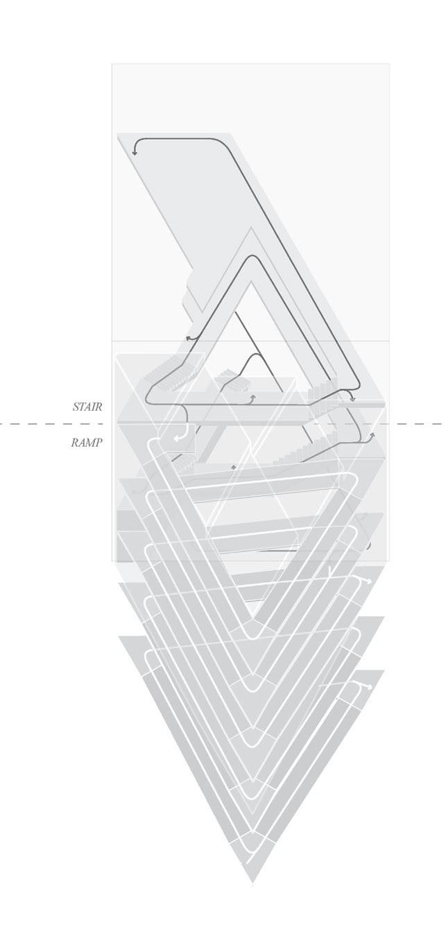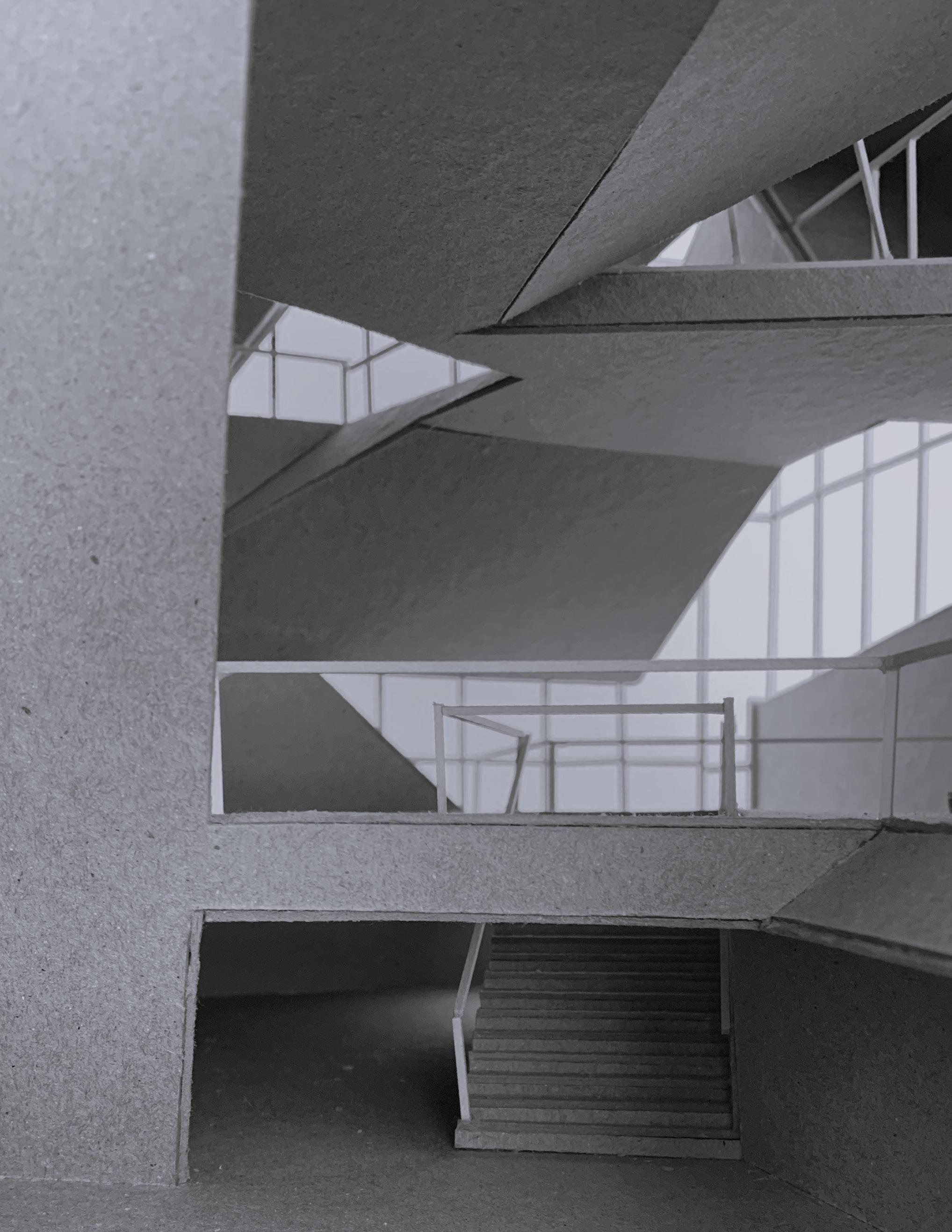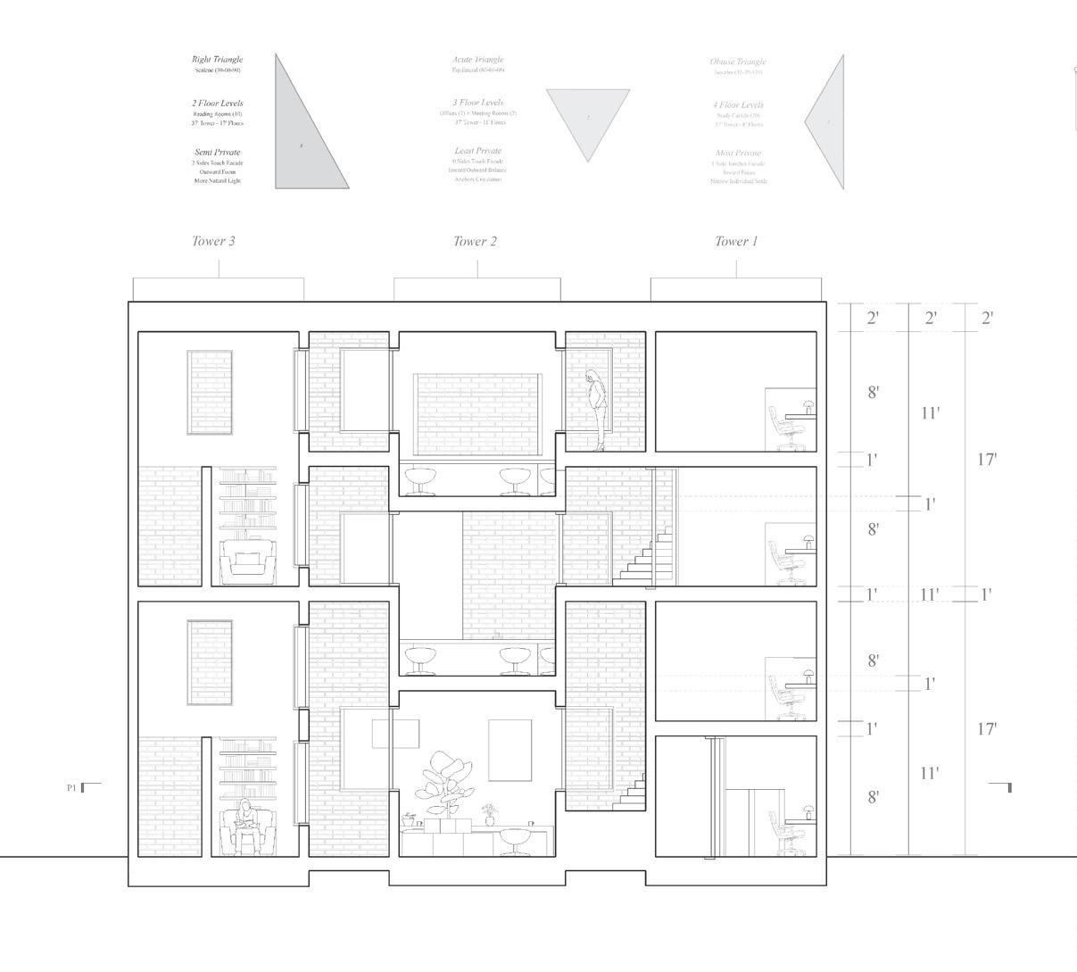 The project begins as a precise act of geometric stitching: three triangular towers of equal height but varying proportion, floors, and program exist within an ordinary square volume and one modest stair. An isosceles obtuse tower rises 4 floors for study carrels (Tower 1), an equilateral acute tower holds 3 floors of meeting rooms and offices (Tower 2), and a scalene right triangle contains 2 floors of reading spaces (Tower 3). Though unified in elevation, the interior is vertically fragmented into a 4–3–2 sectional composition. A triangular stair wraps twice around the central tower, quietly binding these misaligned floorplates into a continuous architectural promenade. Circulation occupies the threshold between inside and outside, making the towers feel like autonomous interiors while movement occurs along their perimeter
