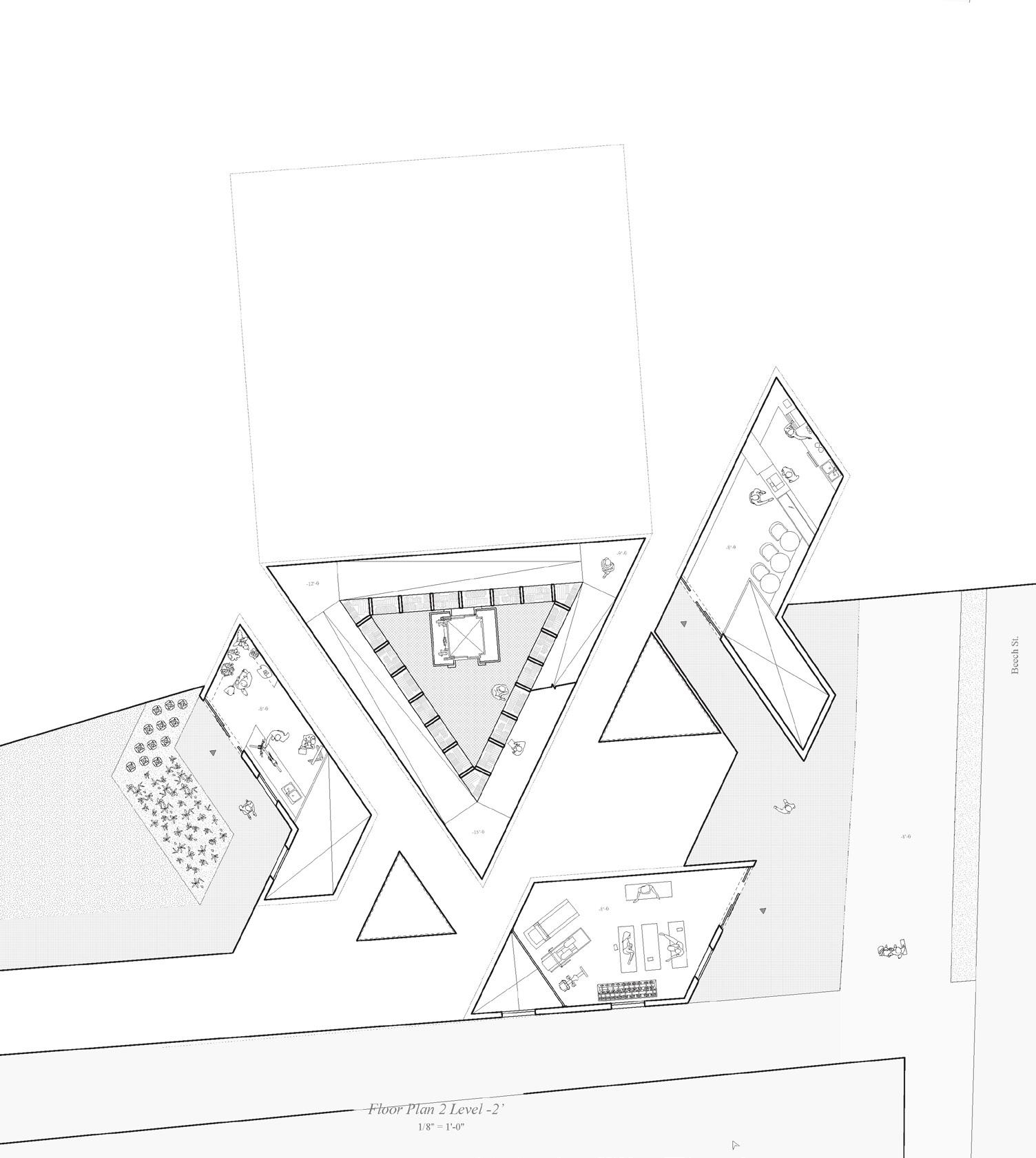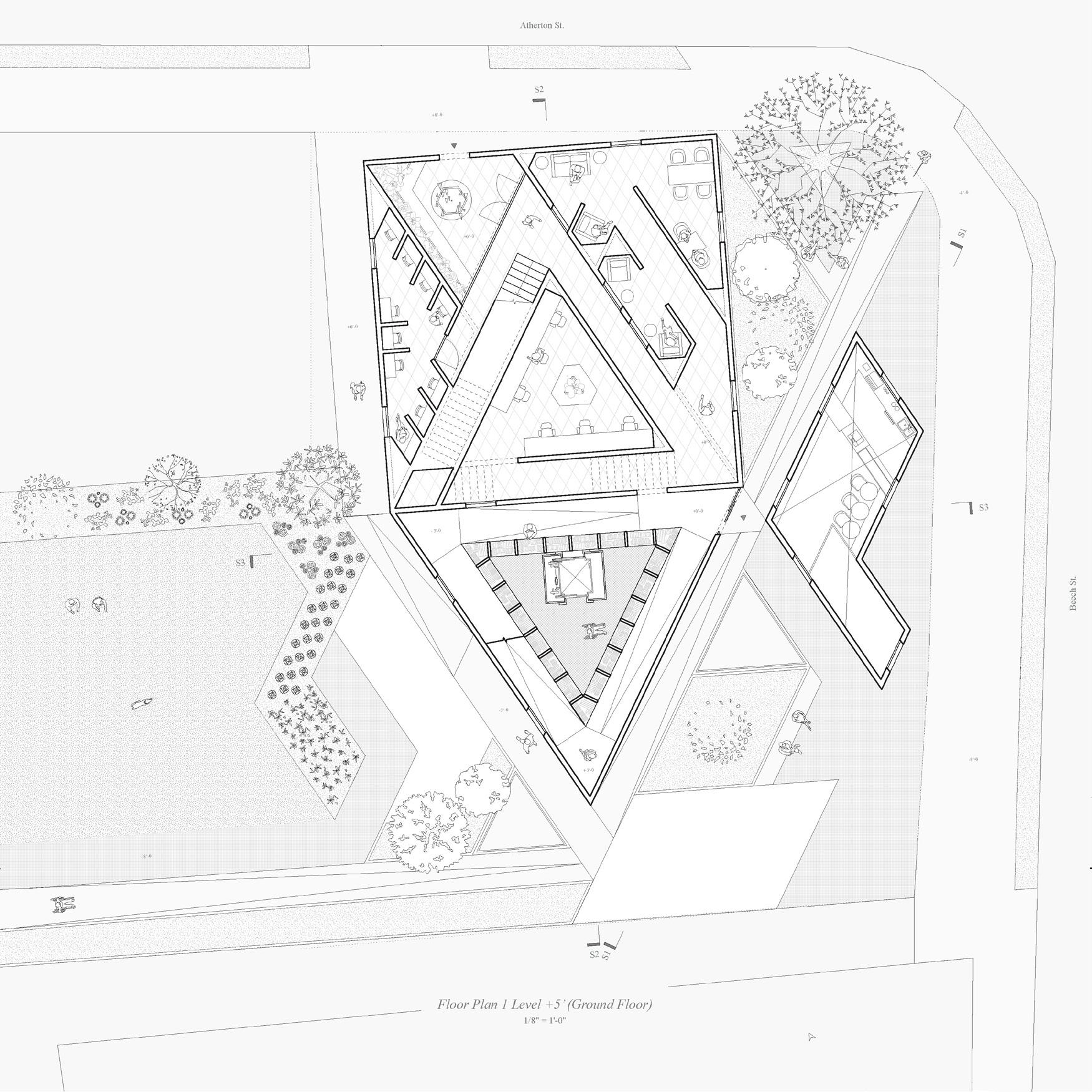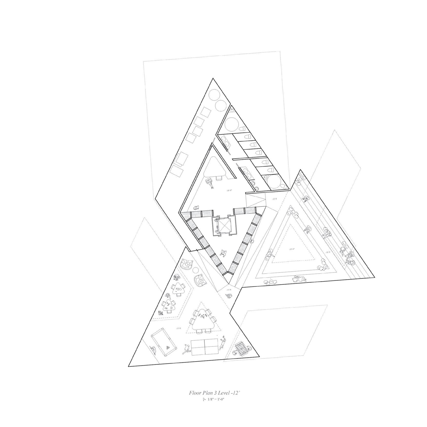 The project begins as a precise act of geometric stitching: three triangular towers of equal height but varying proportion, floors, and program exist within an ordinary square volume and one modest stair. An isosceles obtuse tower rises 4 floors for study carrels (Tower 1), an equilateral acute tower holds 3 floors of meeting rooms and offices (Tower 2), and a scalene right triangle contains 2 floors of reading spaces (Tower 3). Though unified in elevation, the interior is vertically fragmented into a 4–3–2 sectional composition. A triangular stair wraps twice around the central tower, quietly binding these misaligned floorplates into a continuous architectural promenade. Circulation occupies the threshold between inside and outside, making the towers feel like autonomous interiors while movement occurs along their perimeter