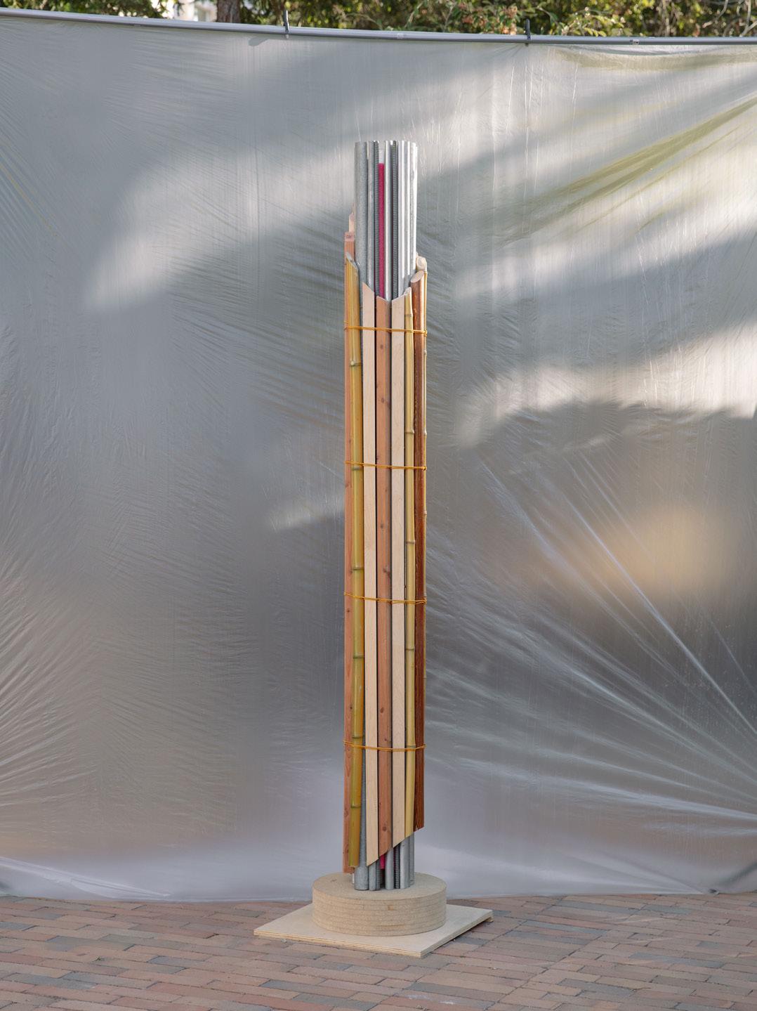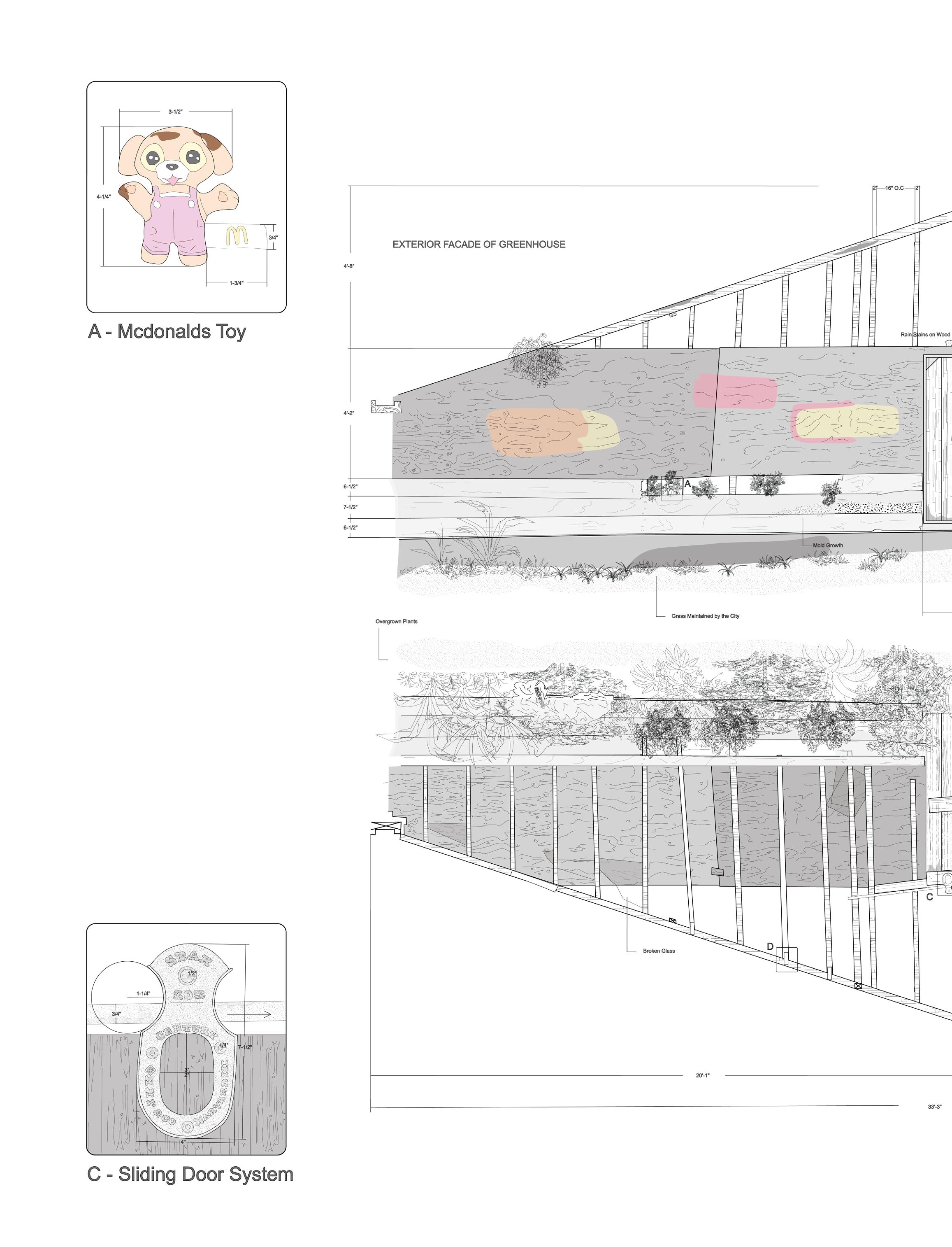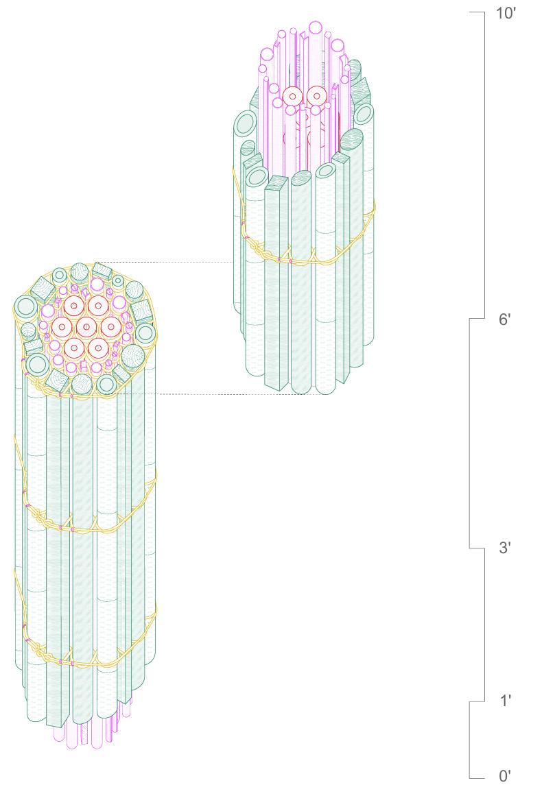 Recycling long and skinny members by strategically filtering and organizing them in order to create an efficient way to build a highly functional column. I was in charge of all architectural drawings shown, as well as leading our construction process, and taking photographs of the process. Jose was in charge of engineering calculations, and Grant was in charge of assembly drawings. We all built the 1-1 model .