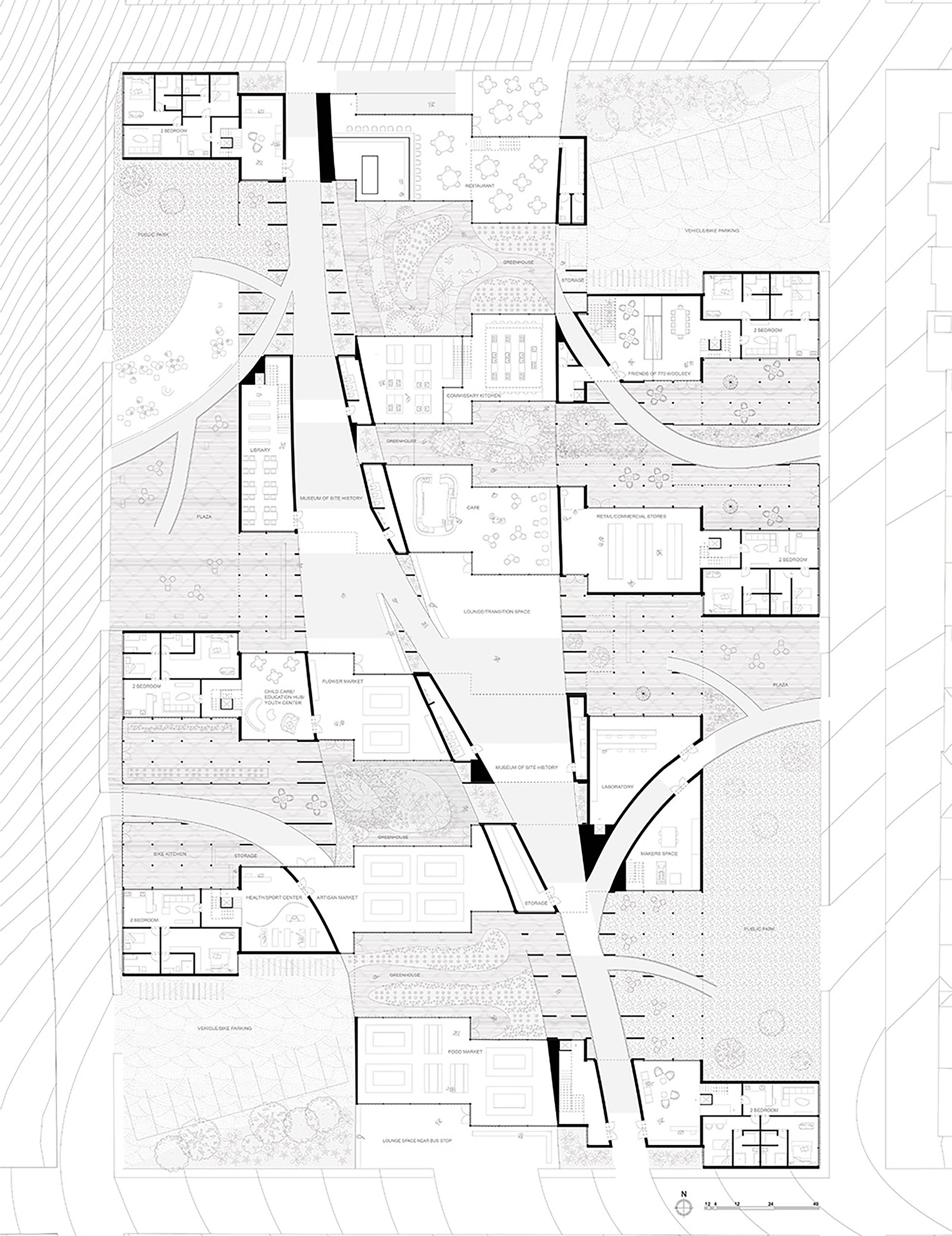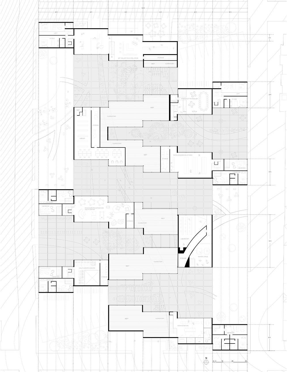 Located in San Francisco’s Portola neighborhood, this agricultural community center seeks to heal the relationship between progress and history. Unique entrances invite and guide visitors through choreographed paths, where moments of inversion stitch together agricultural processes with programmatic community needs. The four buildings exist as separate characters yet form an interconnected network. Opposites— private and public, collective and individual, indoors and outdoors, dark and light, rectilinear and curvilinear, old and new—are in constant dialogue, embracing that one would not exist without the other. It is a careful and beautiful dance of inversions.