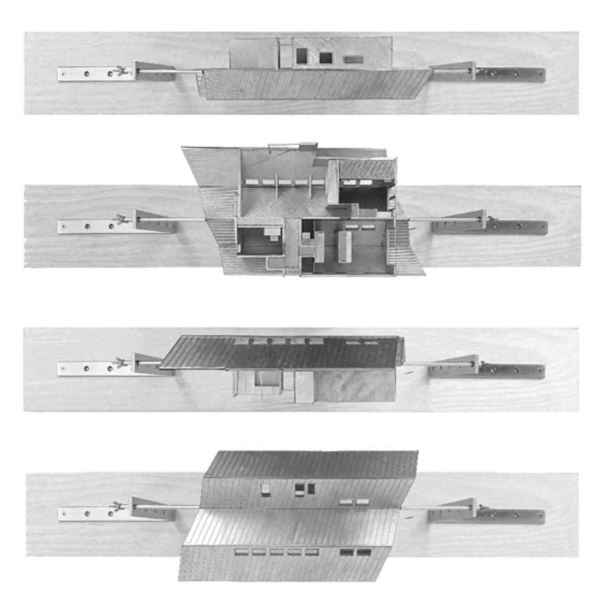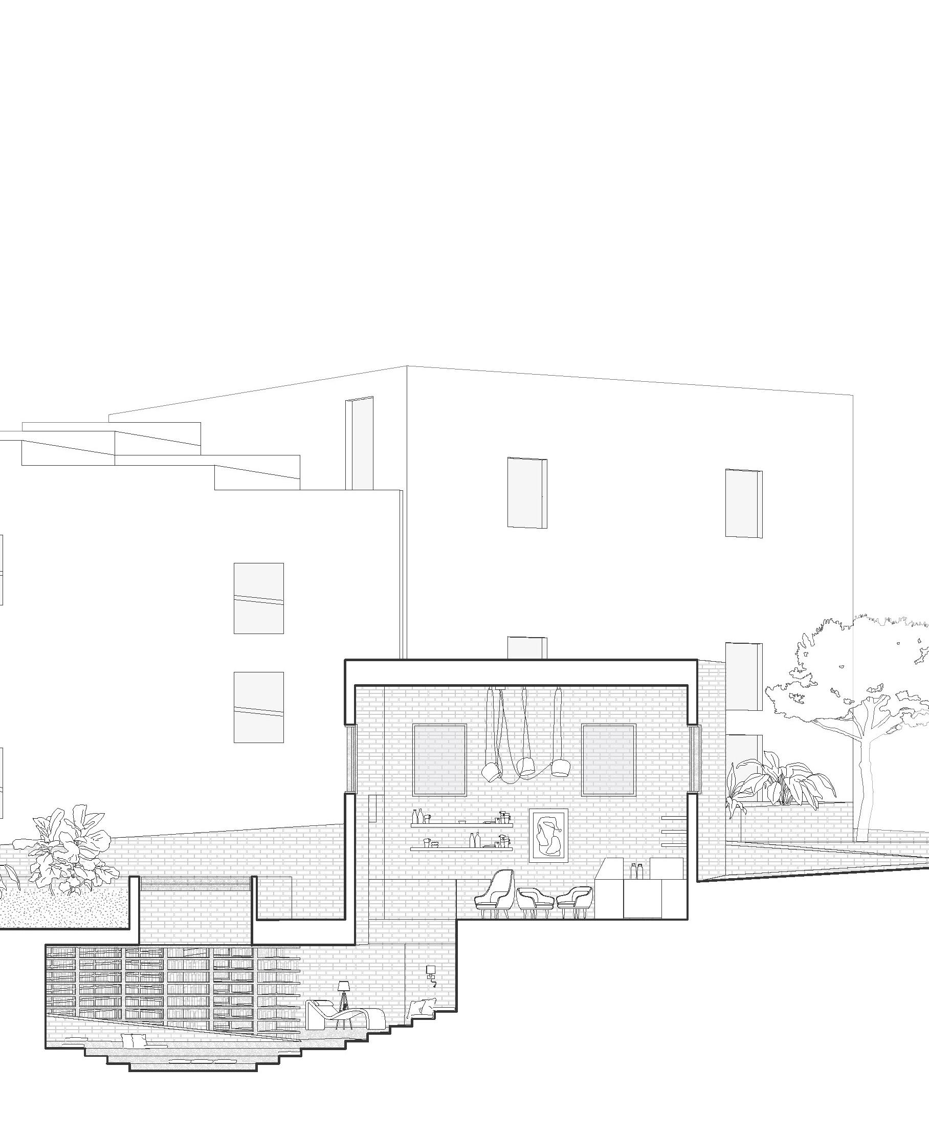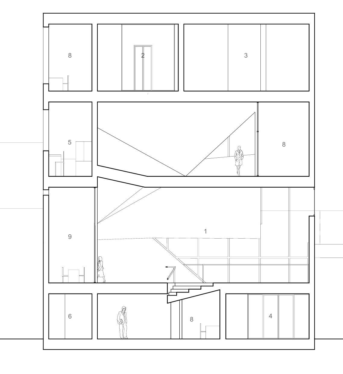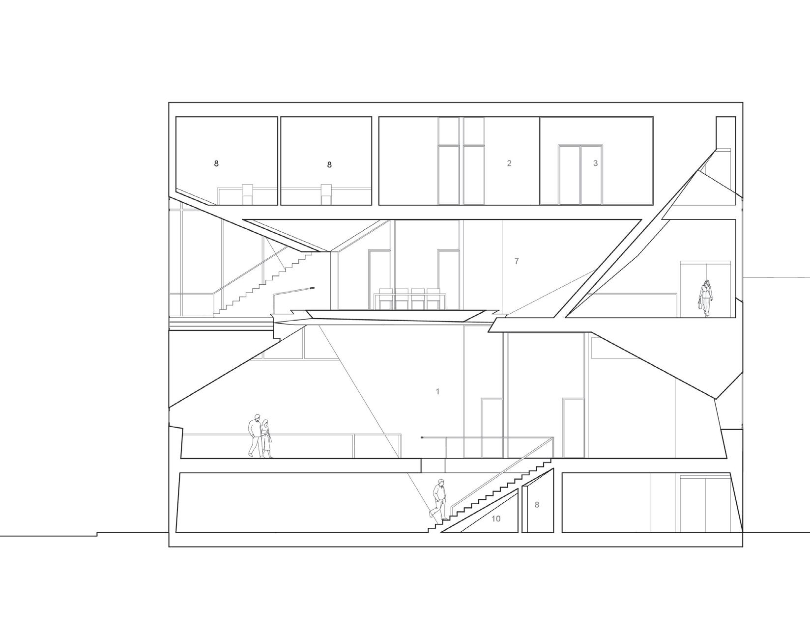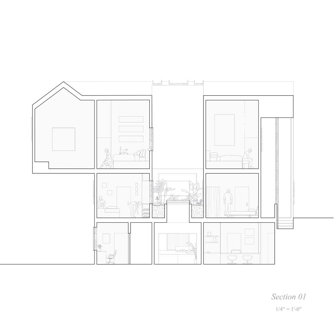 Formally, the duplex presents itself as a single-family house with one roof and a series of gables, its unity emphasized by a vertical elevator core that extends beyond the roofline like a chimney, offering a vernacular inflection. In section, the spatial hierarchy becomes clear: private rooms are discrete and cellular, while public areas are open and fluid, dissolving the boundary between interior and exterior. Yet both readings are mediated by spaces that challenge strict definitions of public and private. A flexible library/dining room transforms through the use of a “Duchampian door,” shifting from an office-adjacent workspace by day to a shared dining room connected to the kitchens in the evening. A private terrace, oriented only toward the sky, offers secluded retreat within the collective envelope. As one moves upward through the plan, the building swells to accommodate increasing shared space, layered incrementally in depth. The migrating courtyard and wrapping circulation stitch these layers together horizontally and vertically.