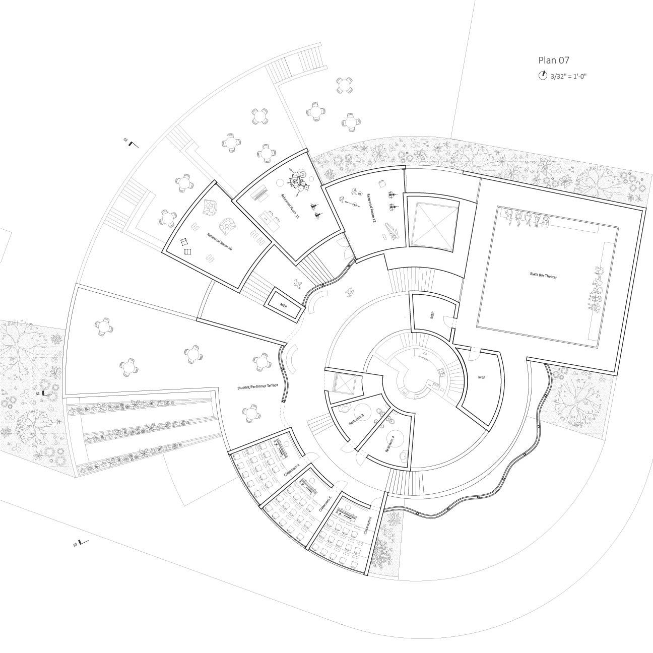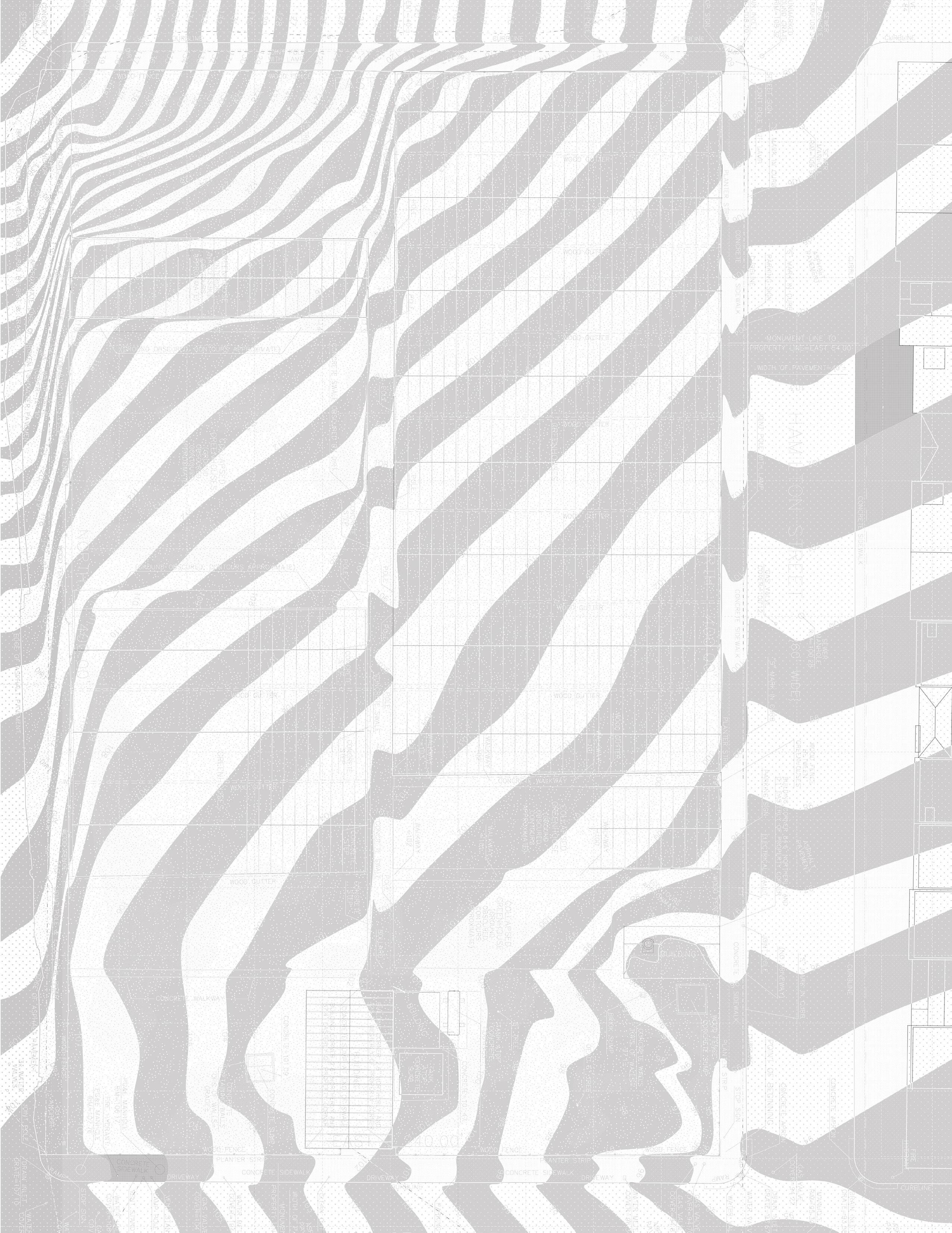 Inside, tight and loose helical stairs counter-rotate around a shared axis while theaters anchor the site. Through this radial organization, movement becomes agency: as bodies ascend and programs revolve, viewer and viewed continuously realign. The building becomes an interplay of vantage points, proximities and thresholds. The project is a spatial equalizer, balancing the many “frequencies” of program: public and private, centrifugal and radial, compression and expansion, movement and pause. The journey through the building becomes its own performance.